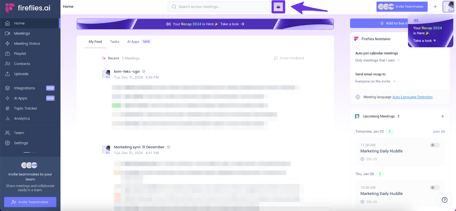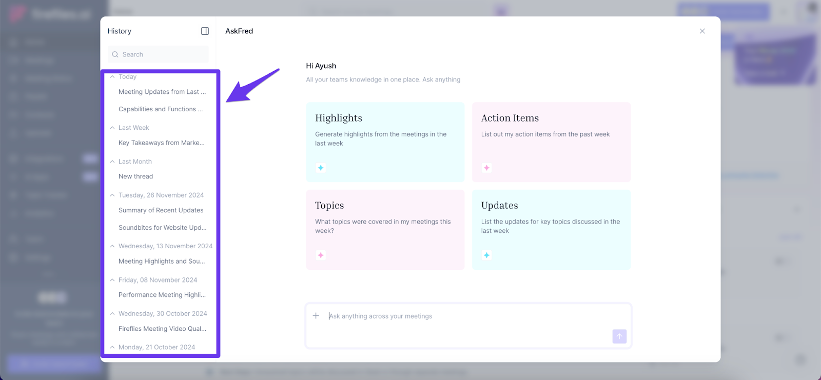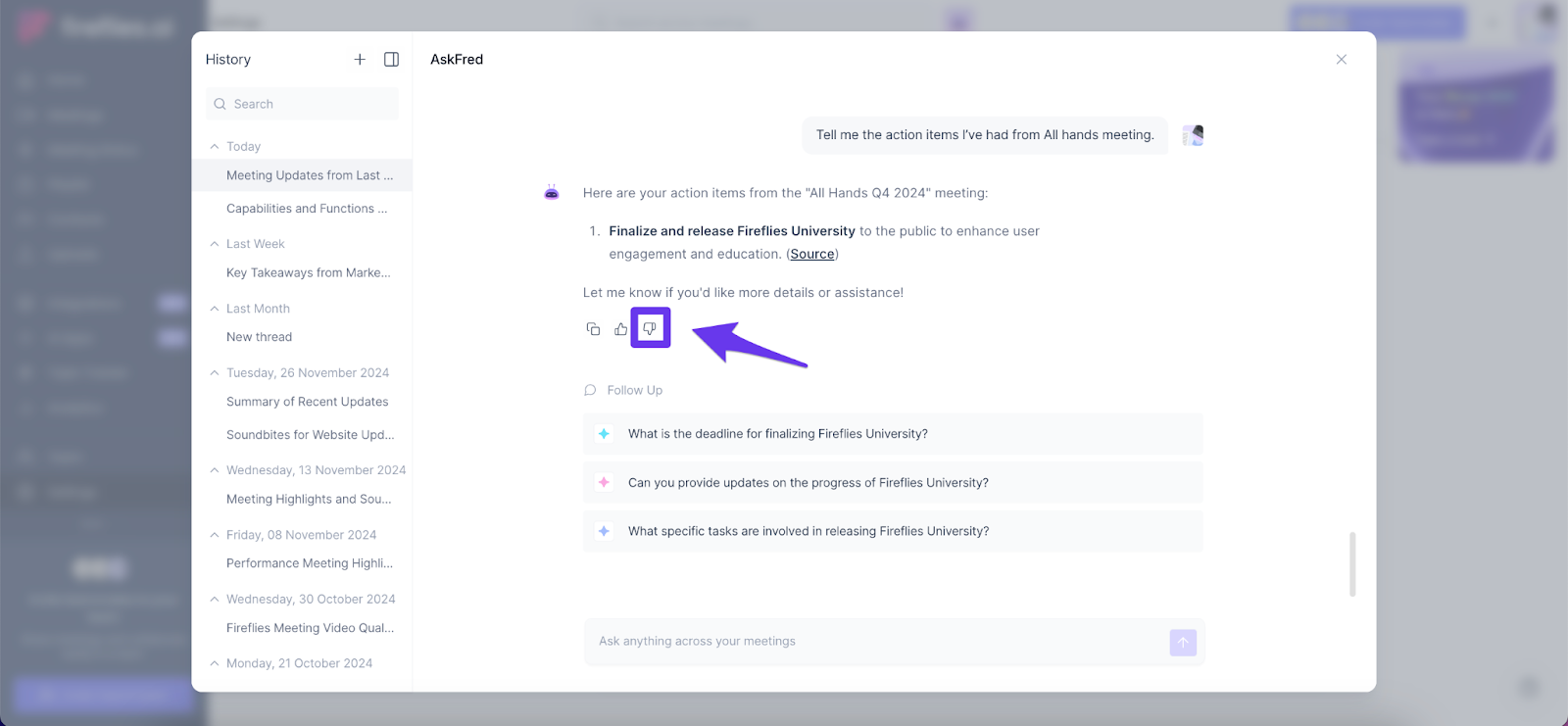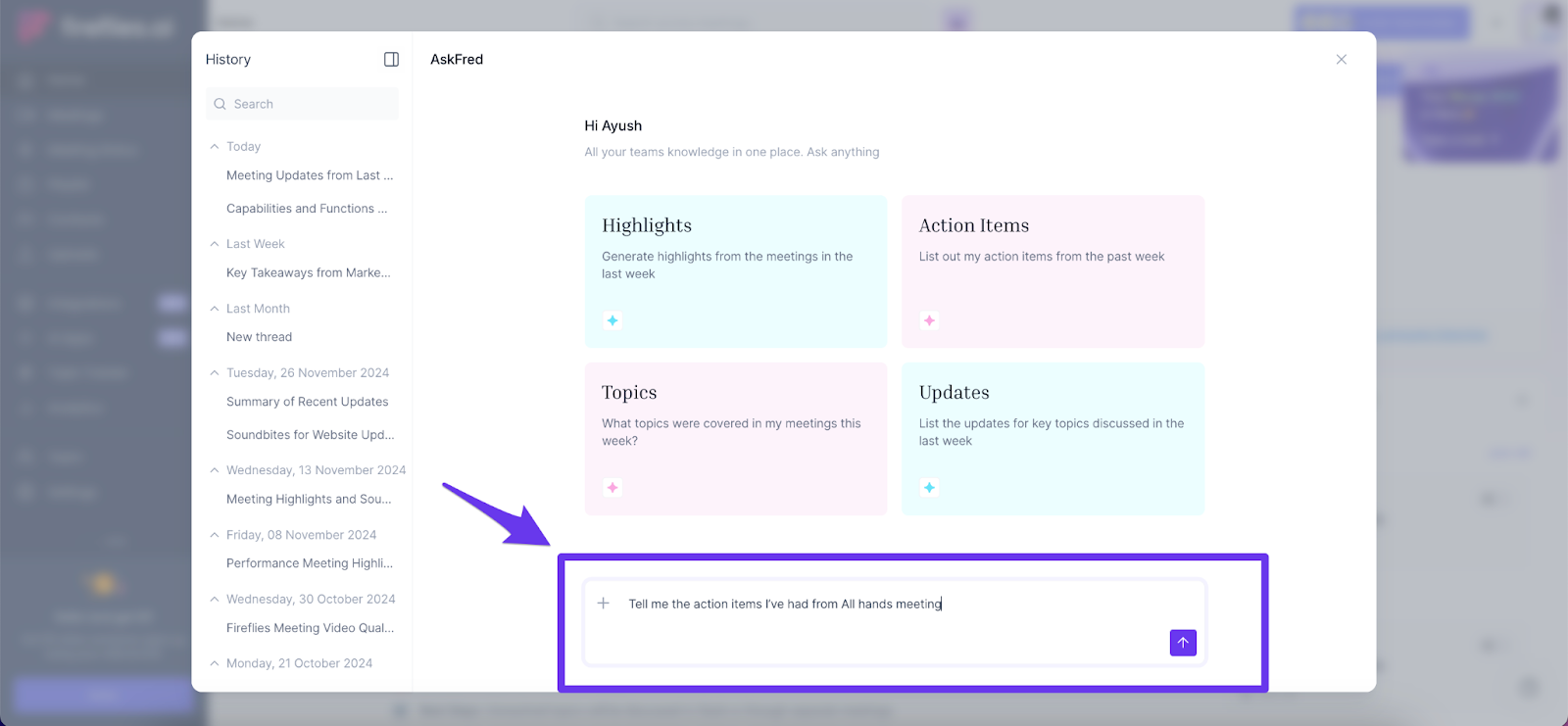 - Go to Fireflies web app and click on the AskFred icon next to the search bar.