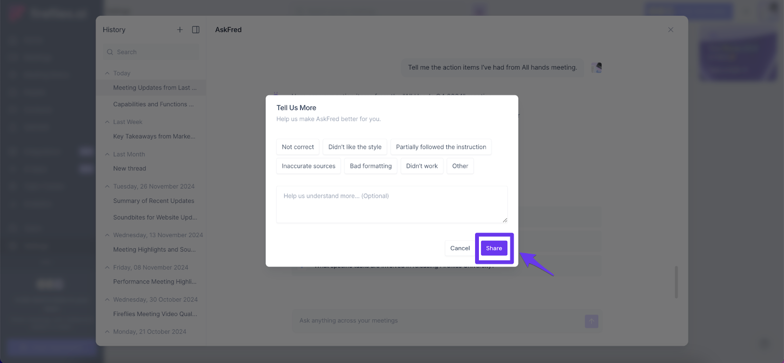 - Explain why the answer was unsatisfactory and select a category. Click "Share" to send your question, the answer, and feedback to our team.