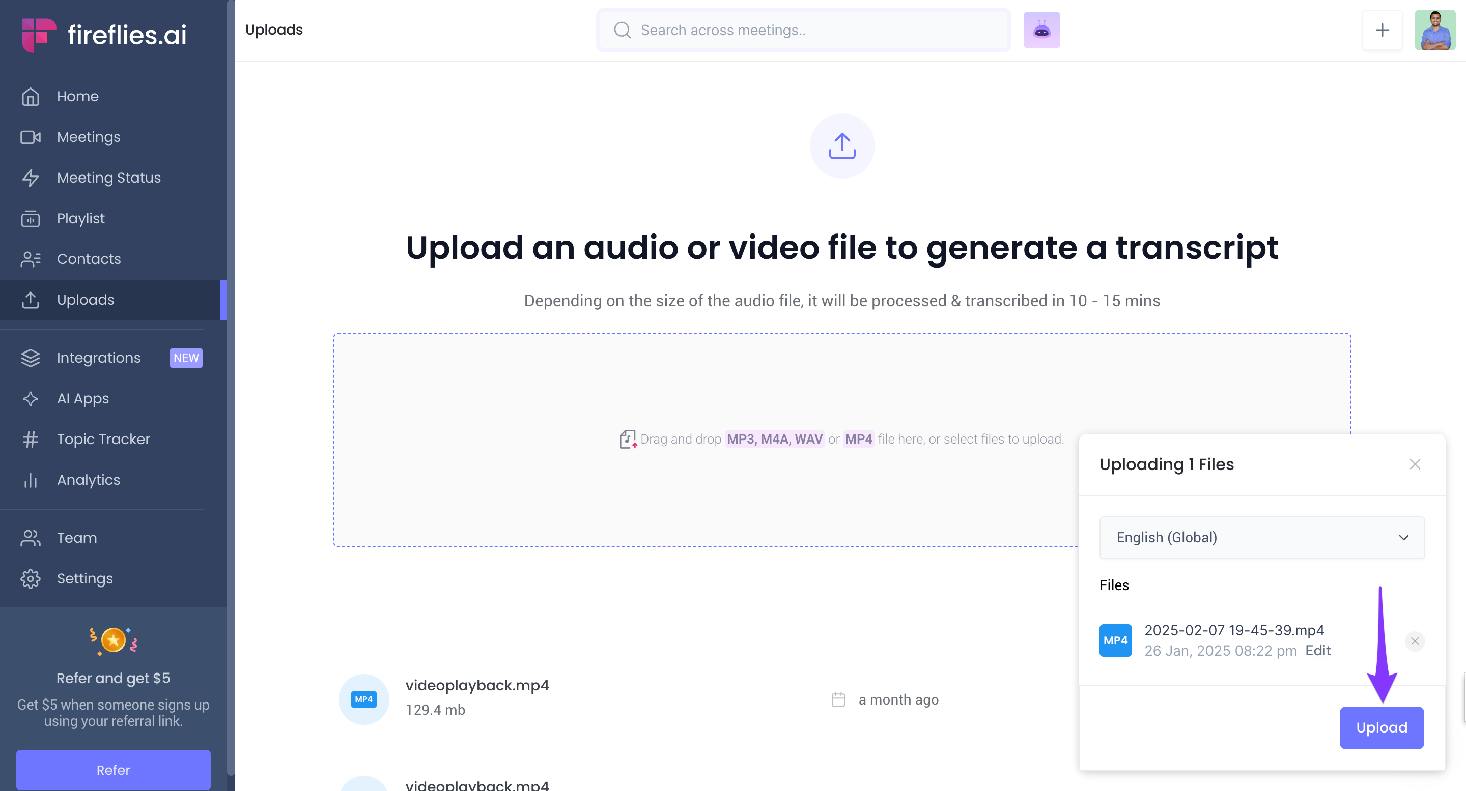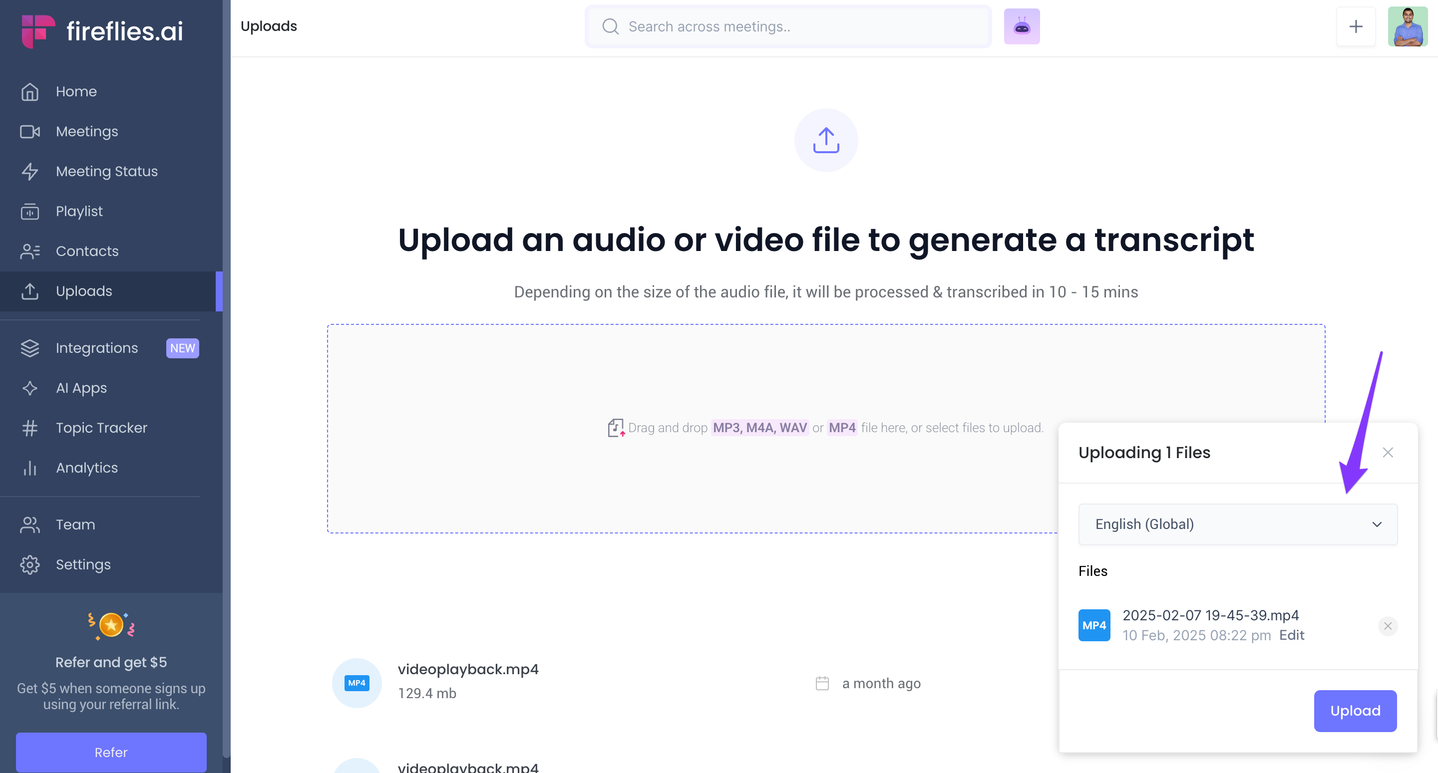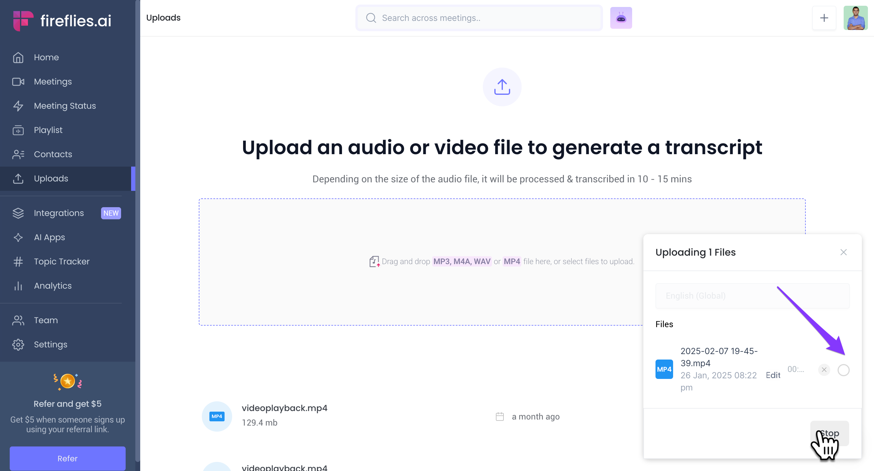 How to upload and transcribe a meeting recording file to Fireflies.ai web app
