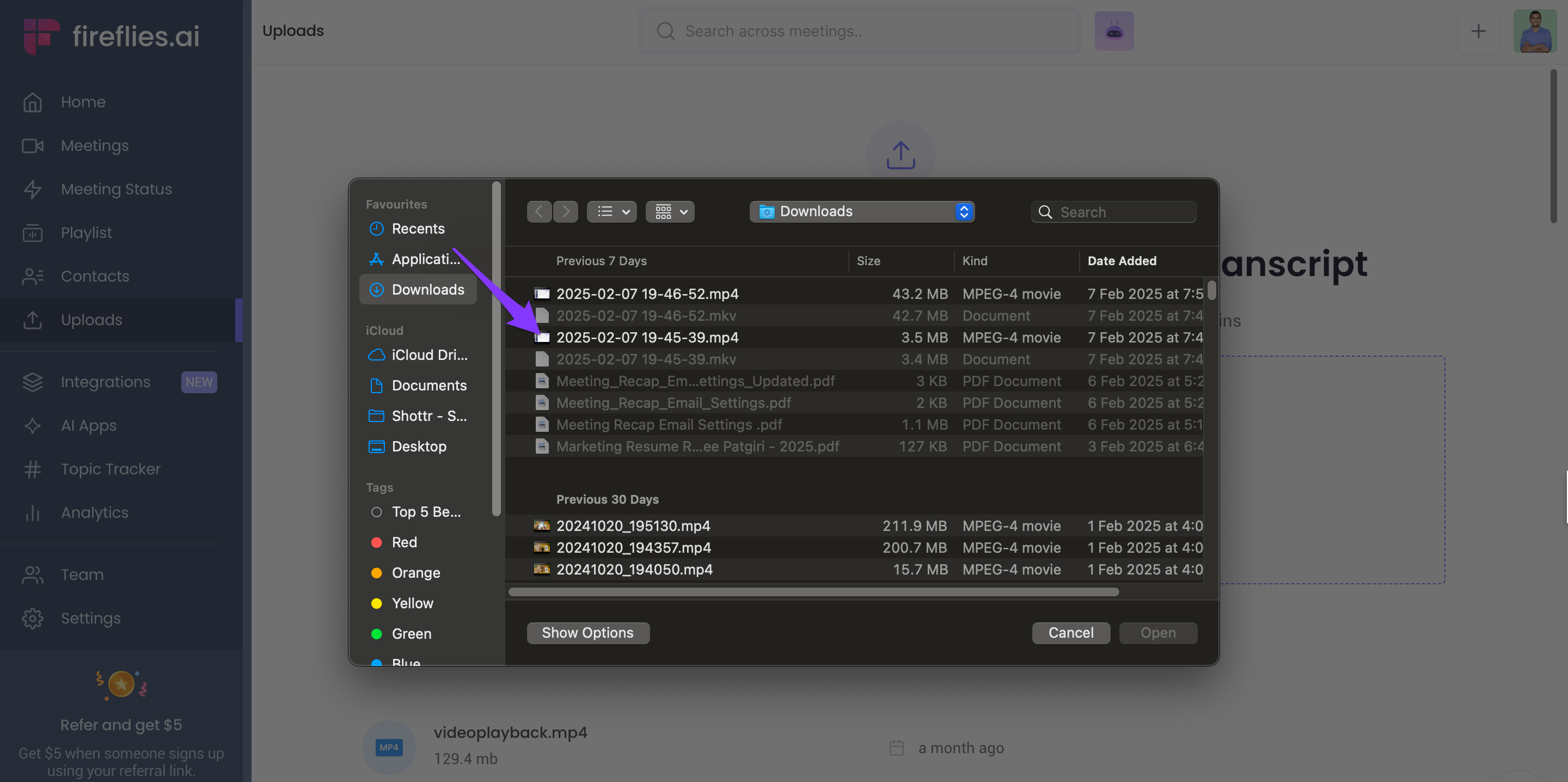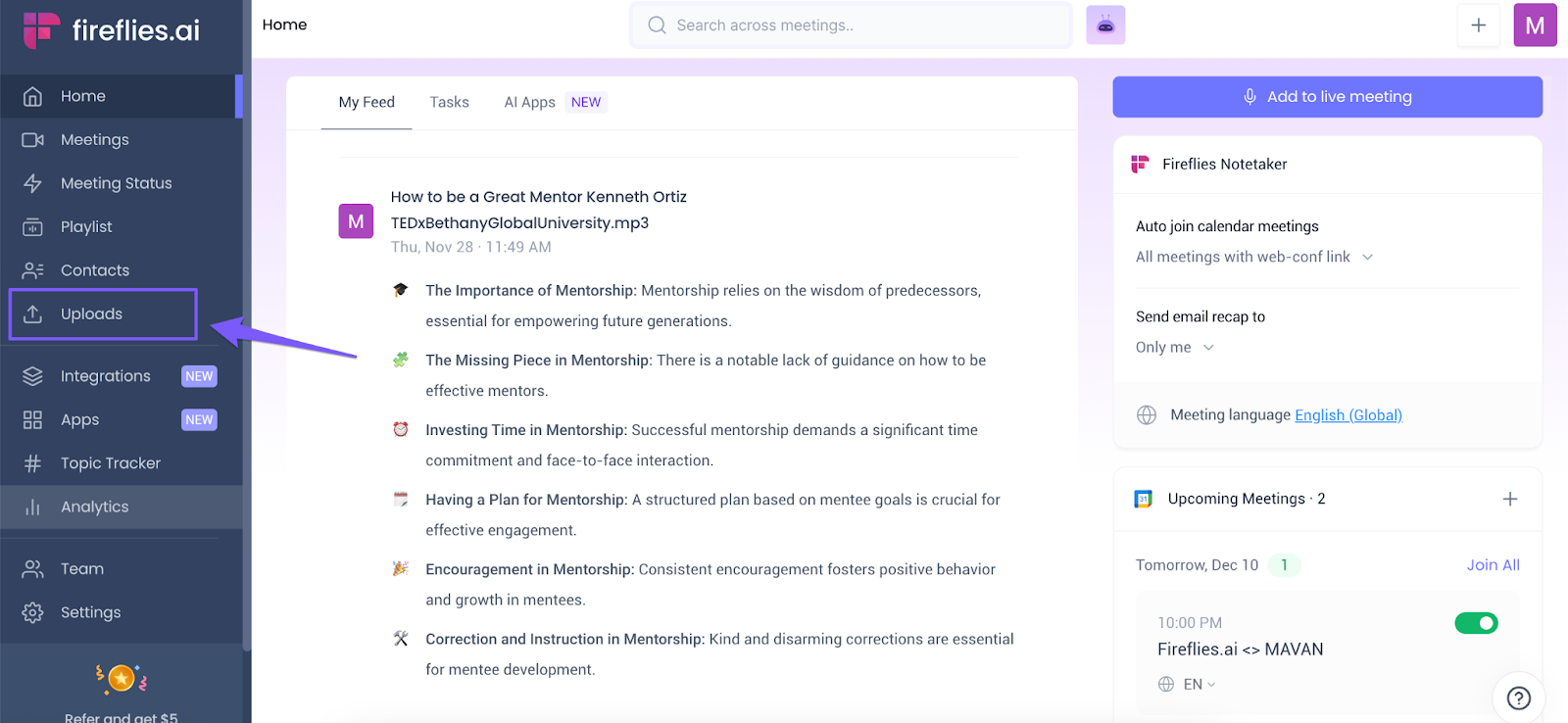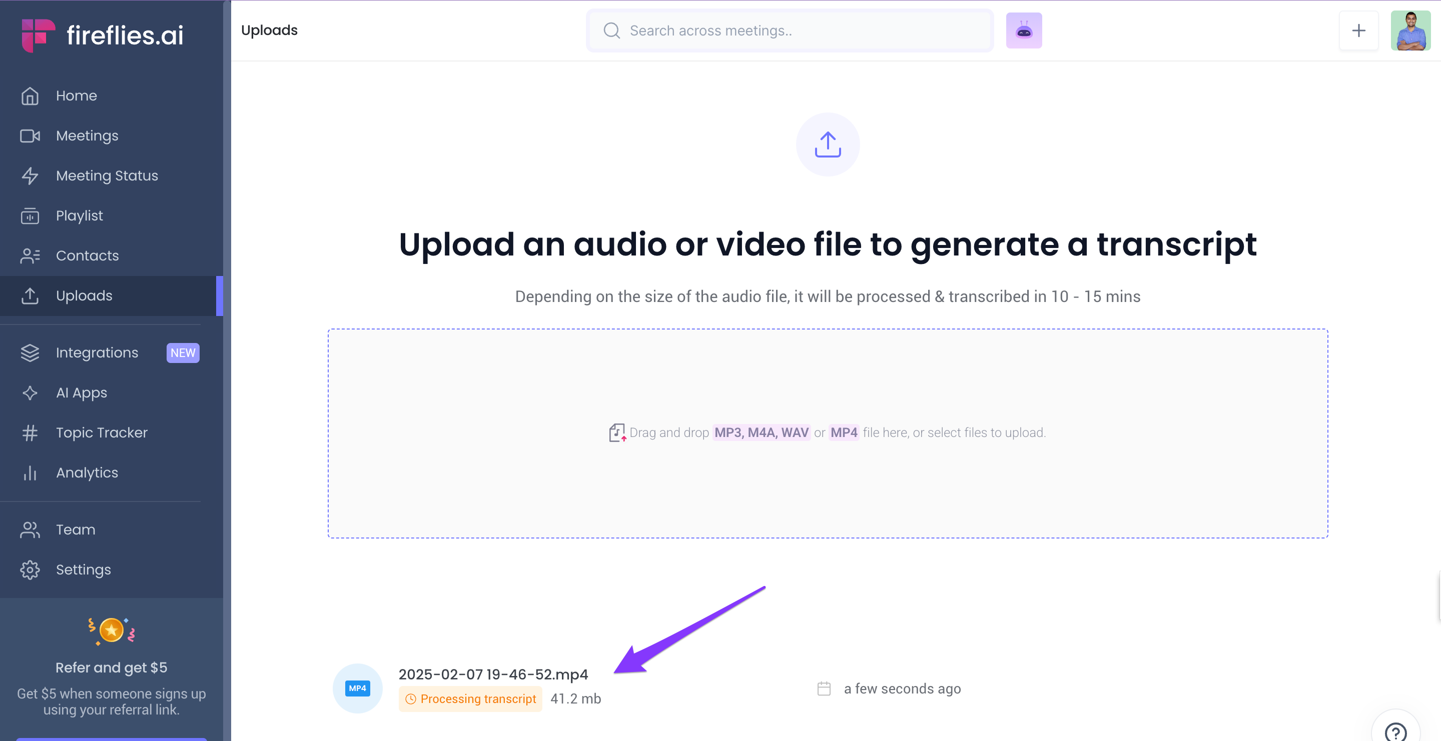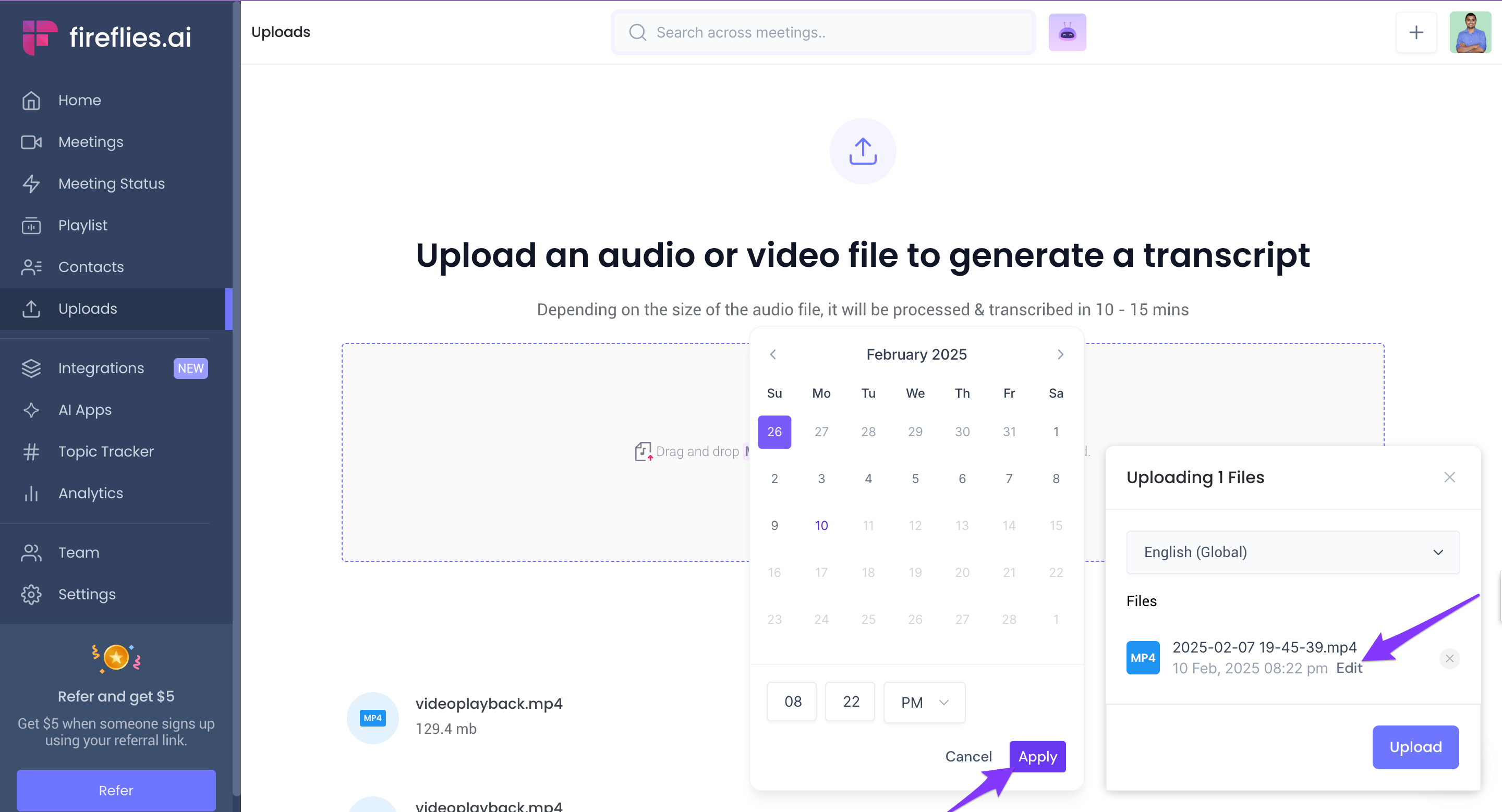 How to upload and transcribe a meeting recording file to Fireflies.ai web app