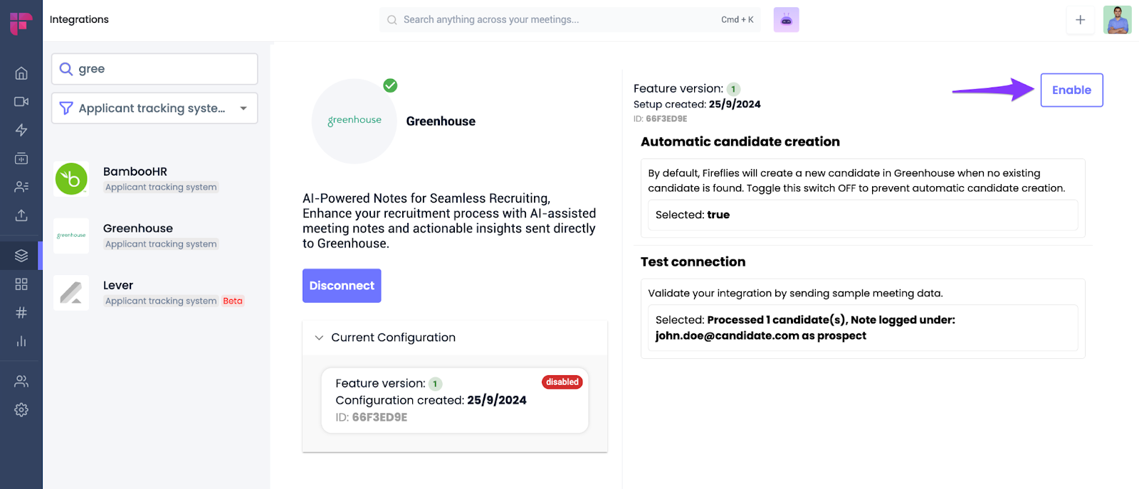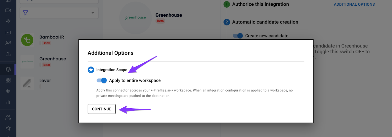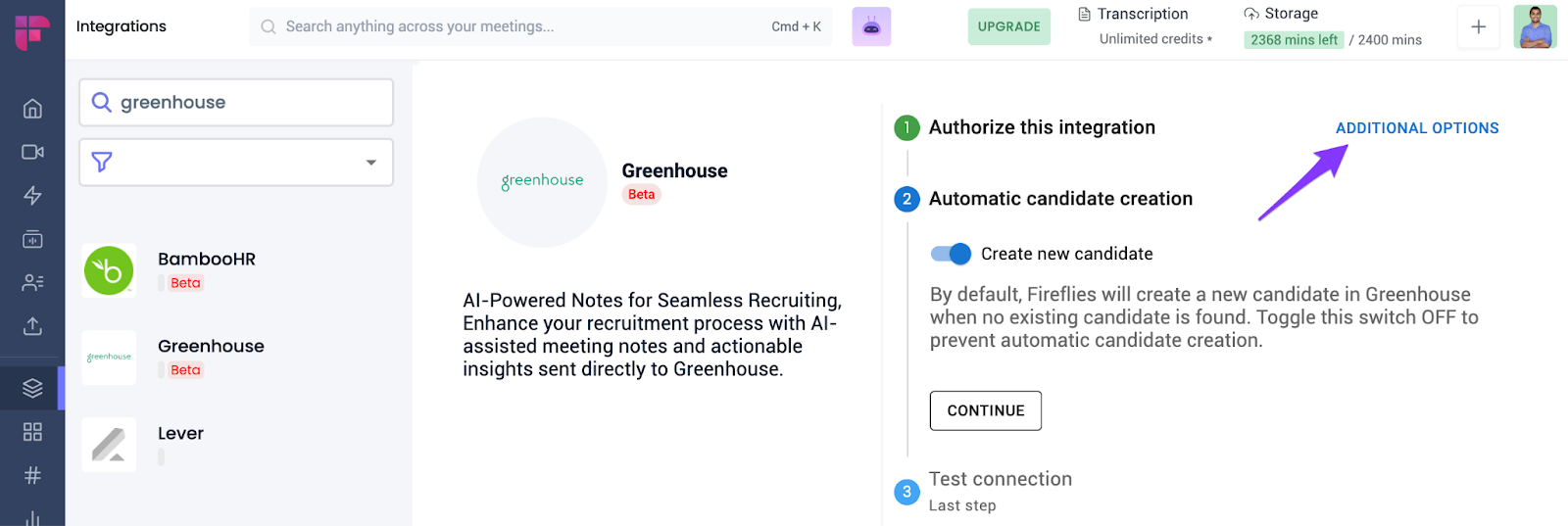 Note: By default, Fireflies will create a new candidate in Greenhouse when no existing candidate is found. Toggle this switch OFF to prevent automatic candidate creation.