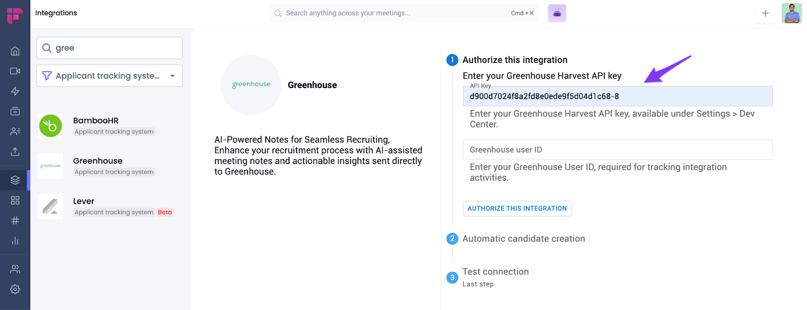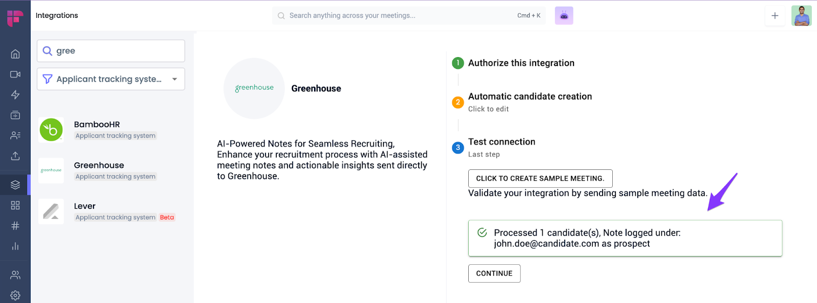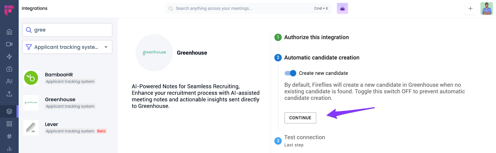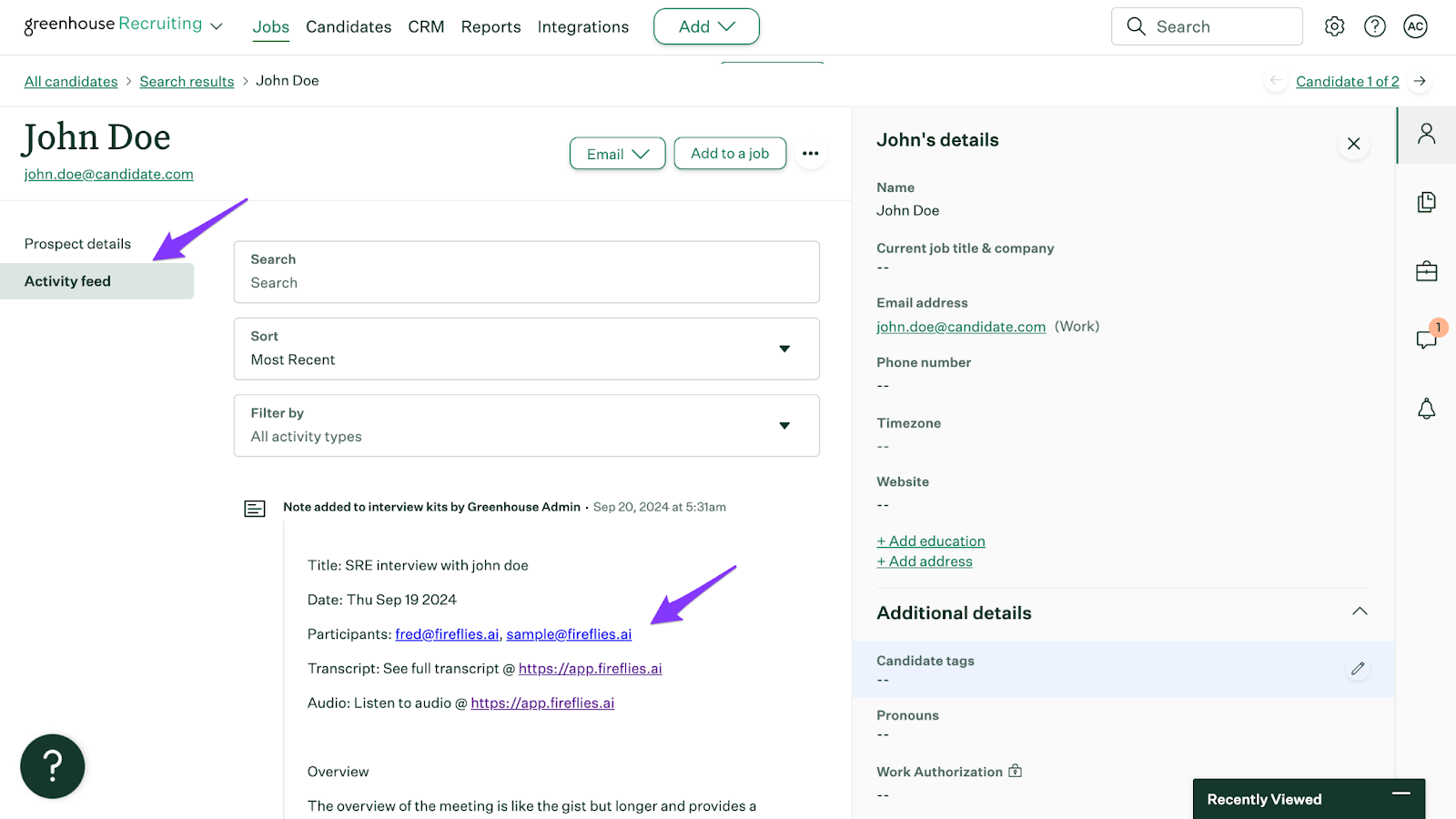Whenever a meeting is scheduled, Fireflies will identify participants from the meeting invite and match their email addresses with candidate profiles in Greenhouse.