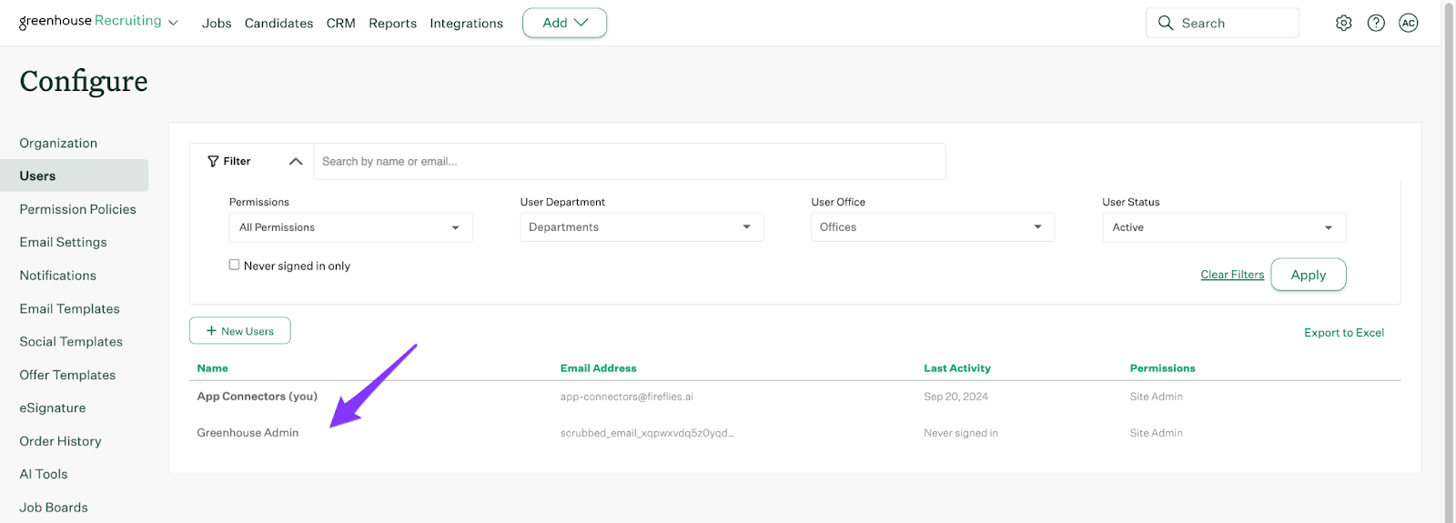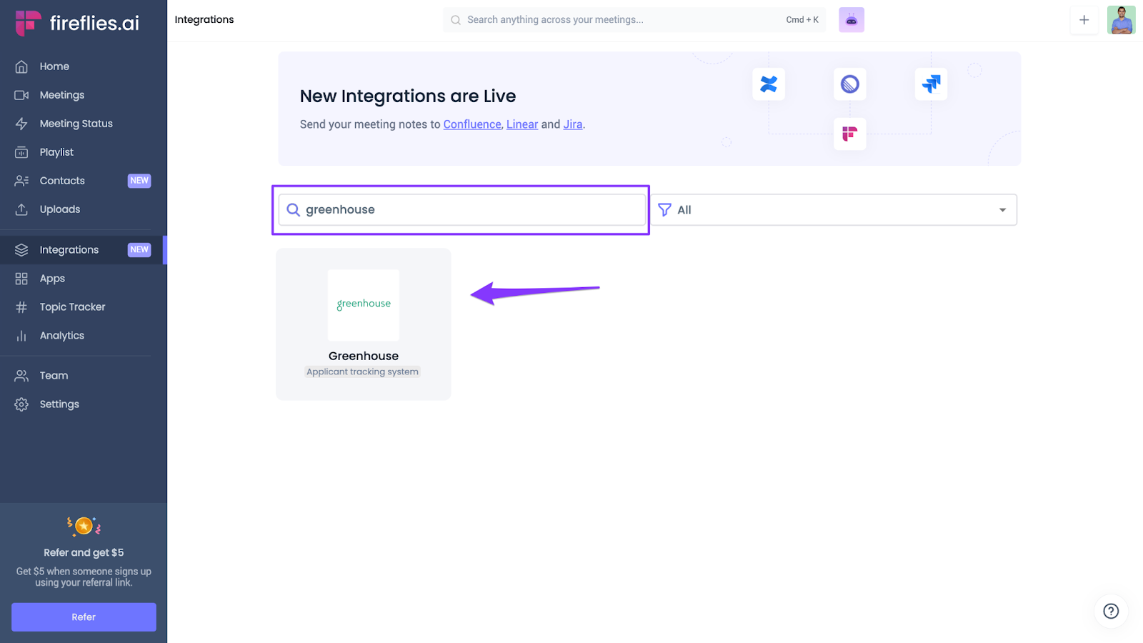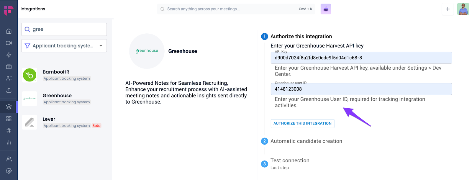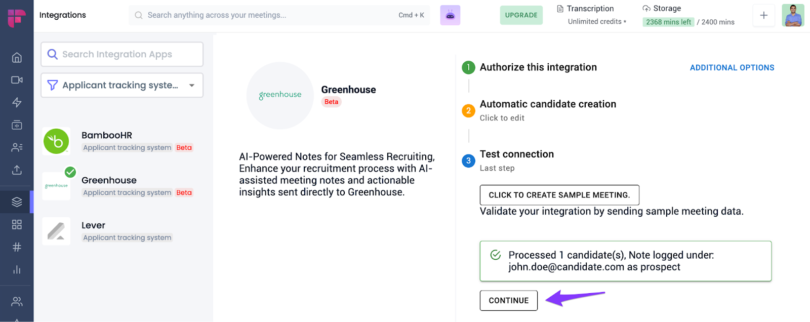 Whenever a meeting is scheduled, Fireflies will identify participants from the meeting invite and match their email addresses with candidate profiles in Greenhouse.