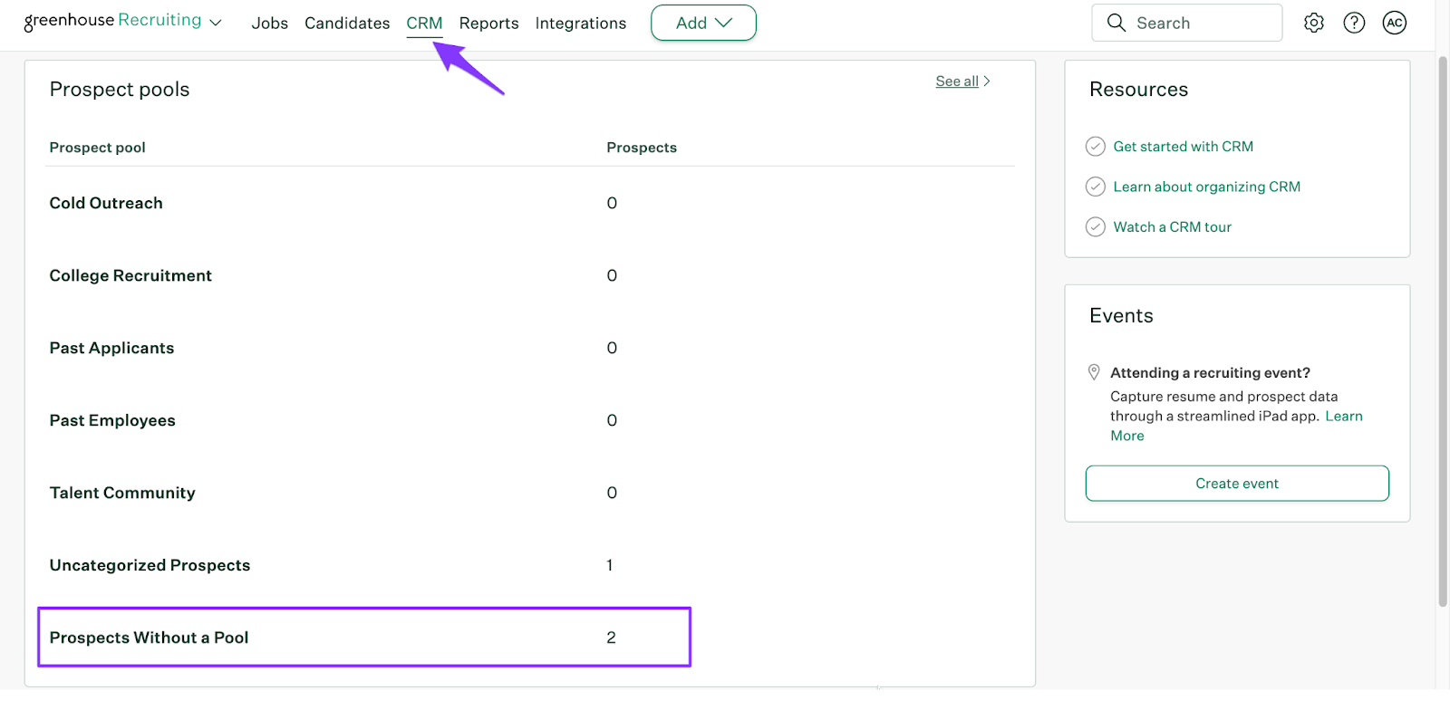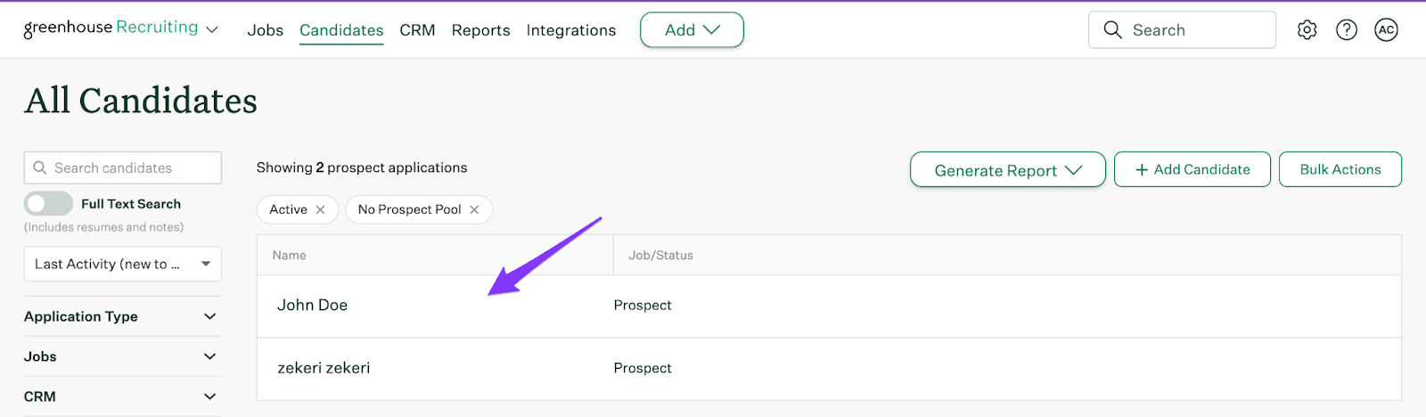- To view the candidates added during the Test connection, click on CRM, and select Prospect Without a Pool.