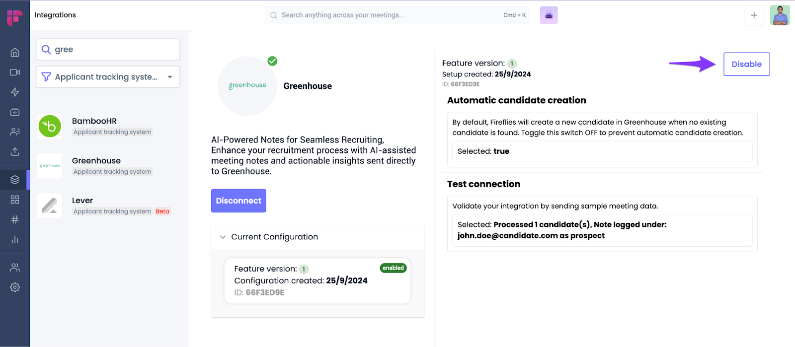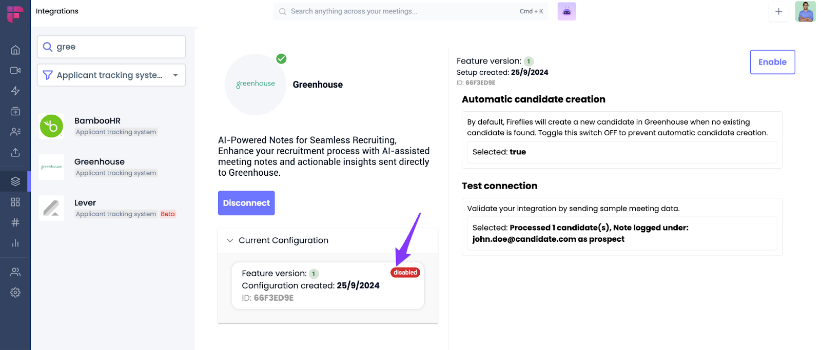 - Your Greenhouse integration is now disabled. You’ll see a disabled icon under Current Configuration.