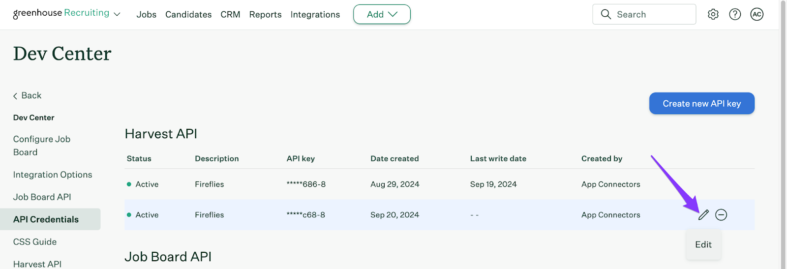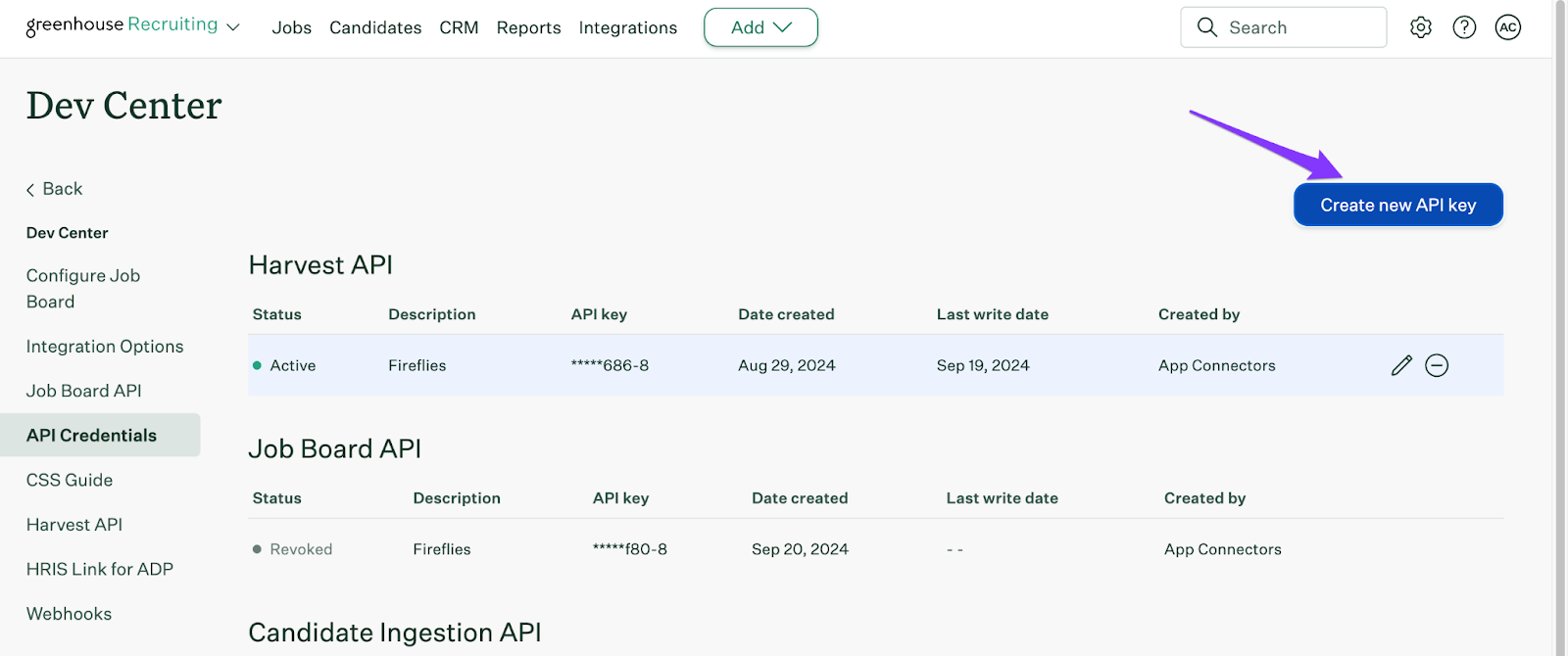 - Once you click connect, you will need to enter the Harvest API key and User ID from the Greenhouse dashboard. Here’s how to do that: