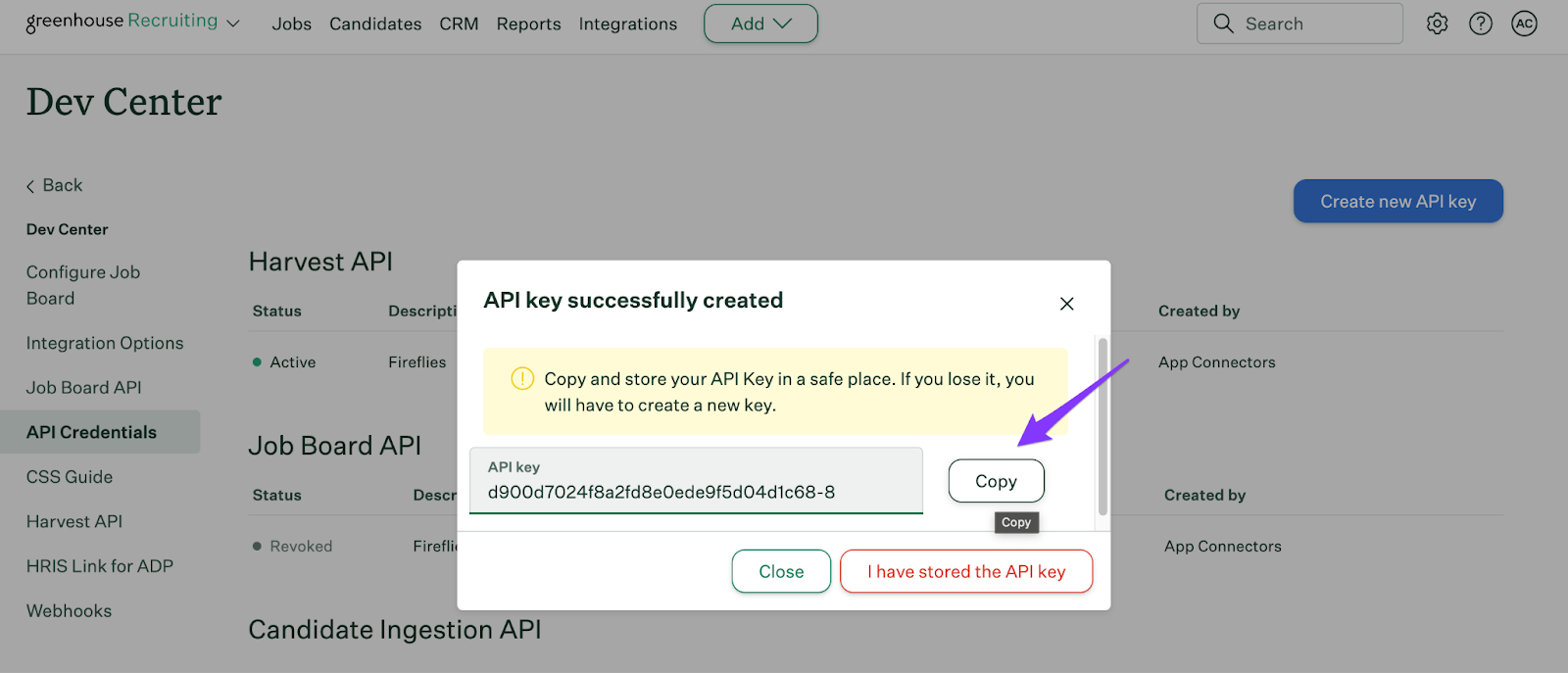 - Copy and save the API key in a secure location. Note that the API key will only be visible once. If you don’t copy it, you’ll need to create a new one if required later.