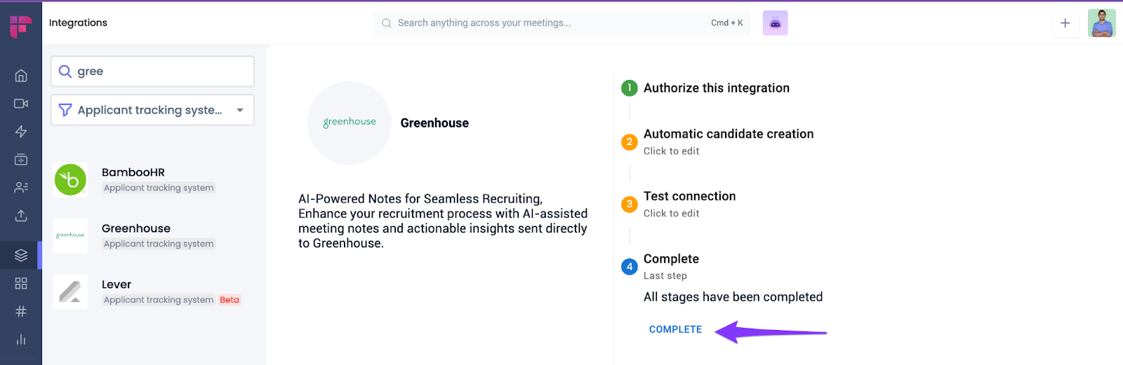 - You will now see a green color tick mark on the Greenhouse icon, indicating that the integration has been completed successfully.