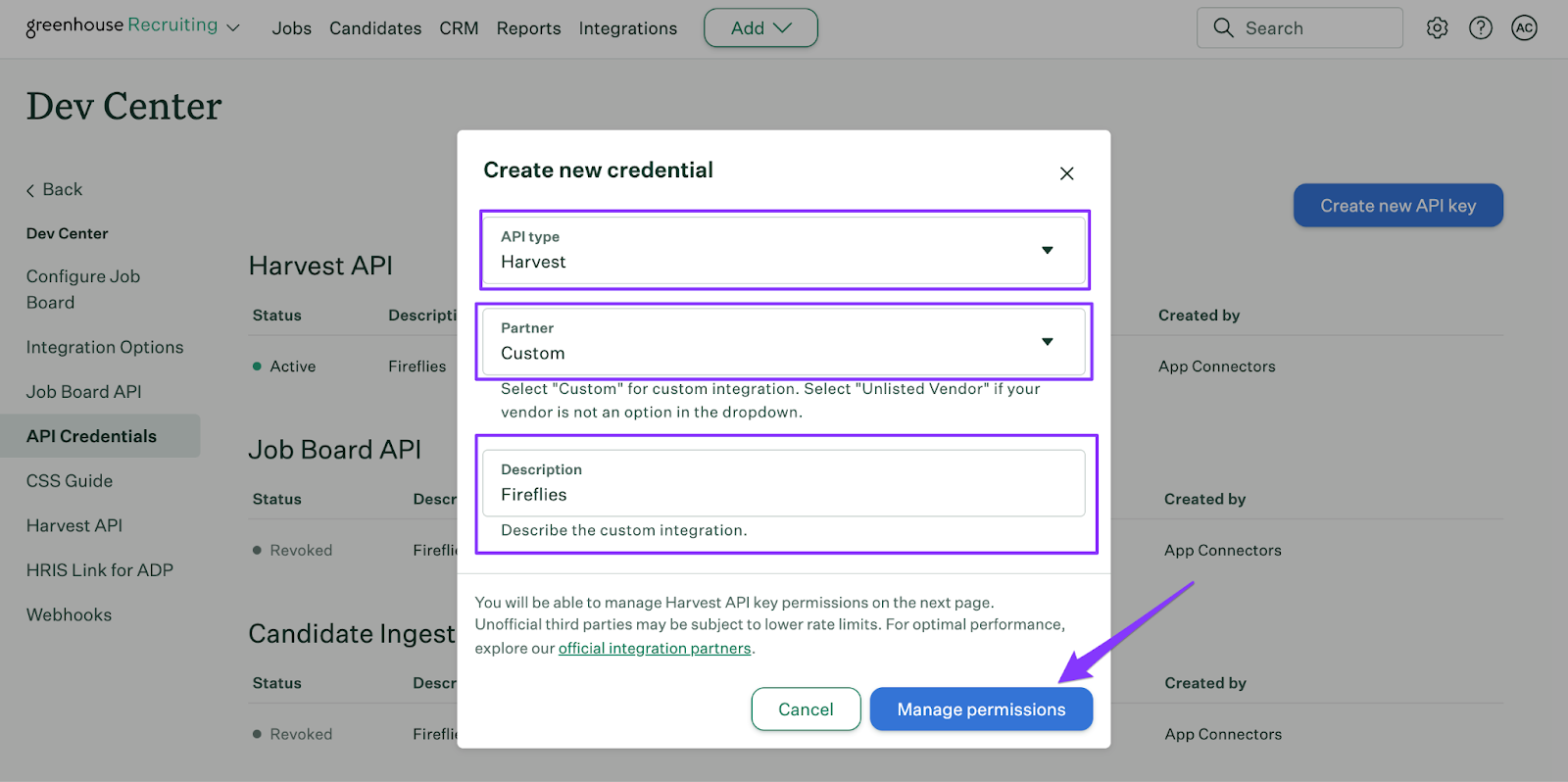 - Enter the API type as Harvest, Partner as Custom and Description a default description. Then click Manage permissions.