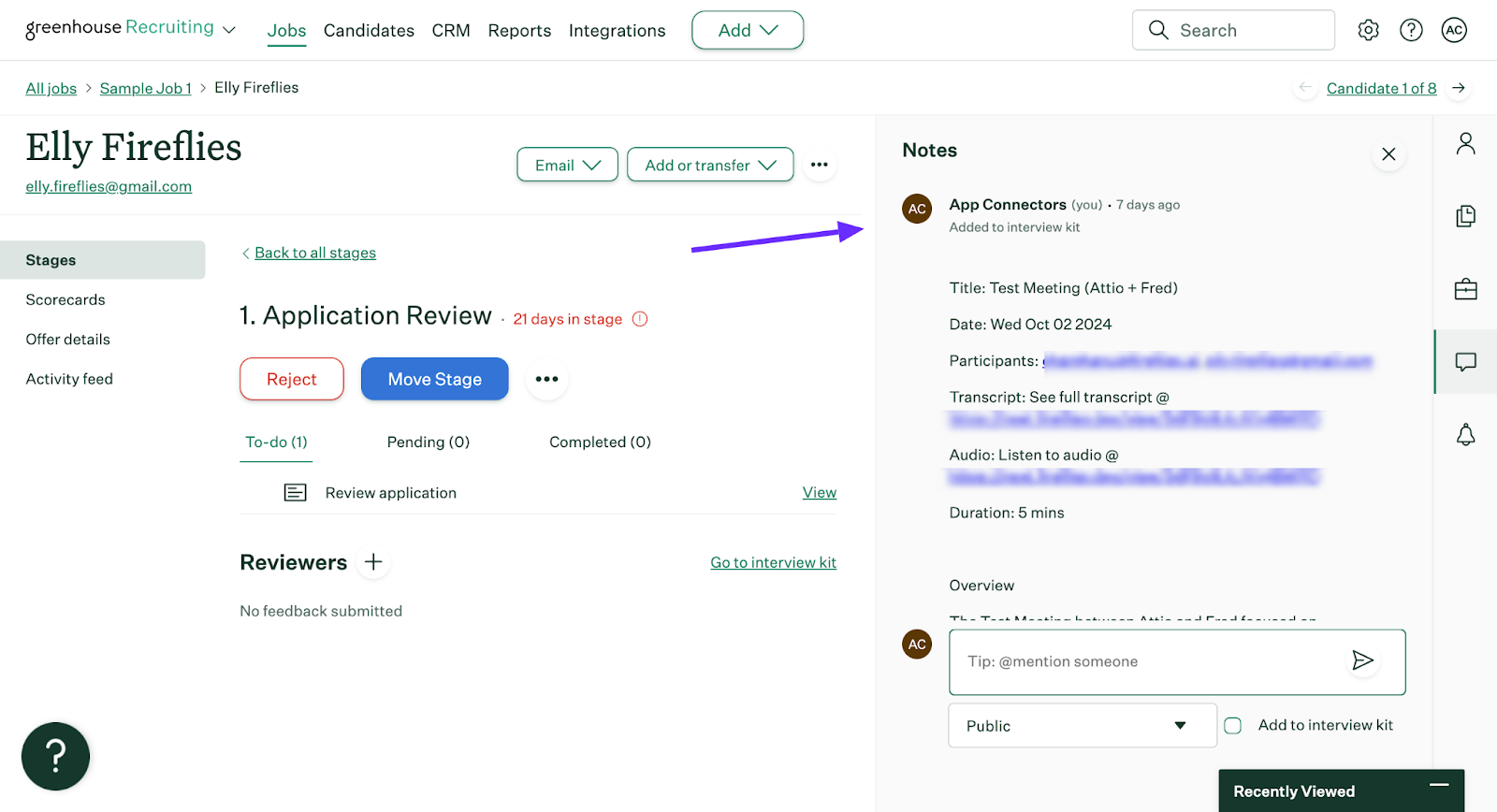 To view the meeting notes in Greenhouse after your meeting, follow these steps: