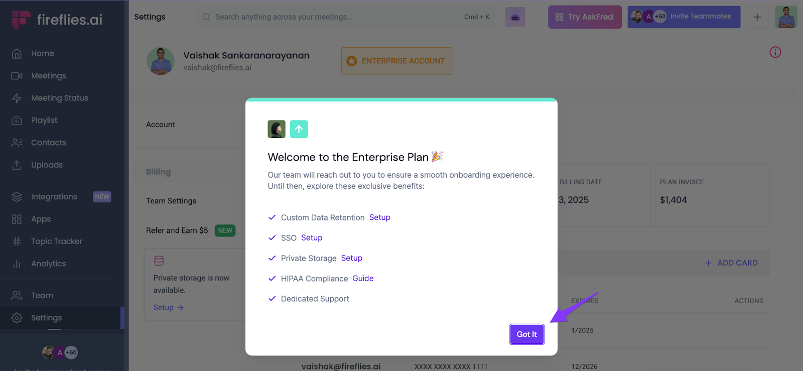 - After upgrading, you will receive a welcome message and resources for setting up private storage and SSO. These features are exclusive to the Enterprise plan. Once you set up everything, click Got it to close the pop up.