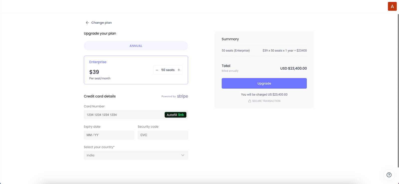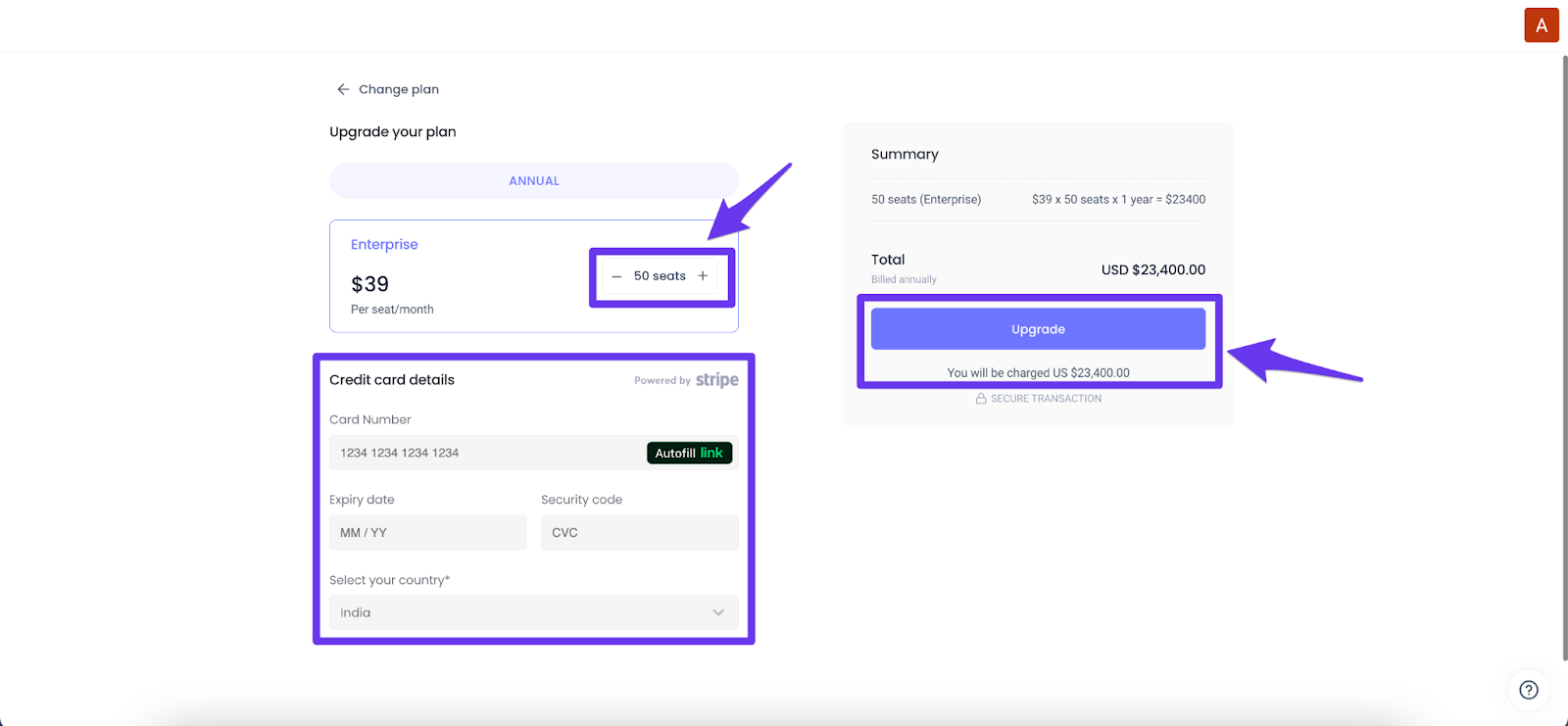 - Enter the number of seats and card details and click Upgrade.