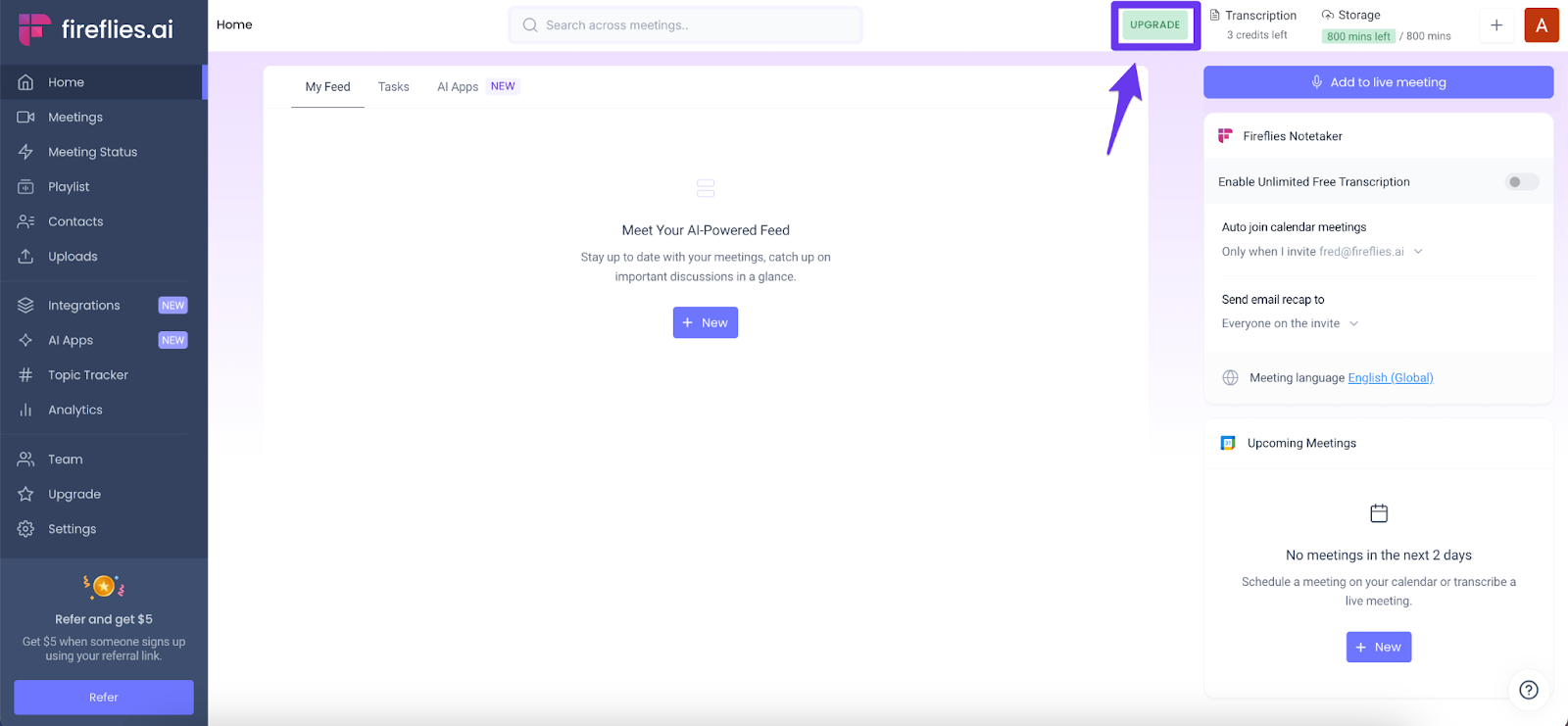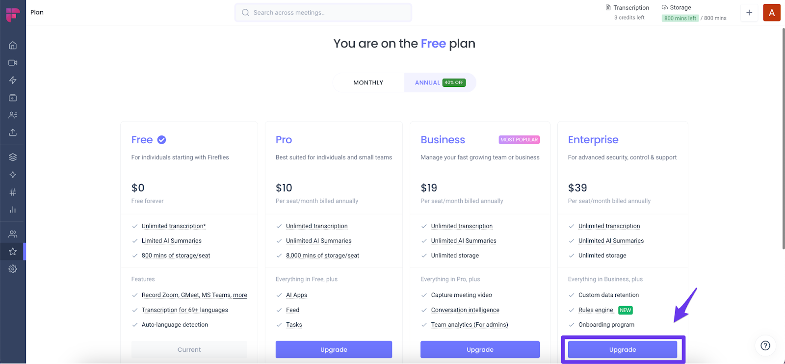- Go to Fireflies web app and click Upgrade.