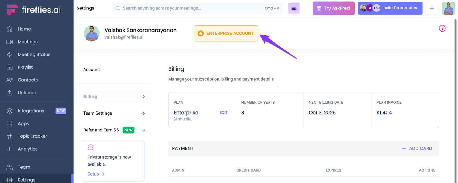 - On the Billing page, you will notice that your account is upgraded to the Enterprise plan.