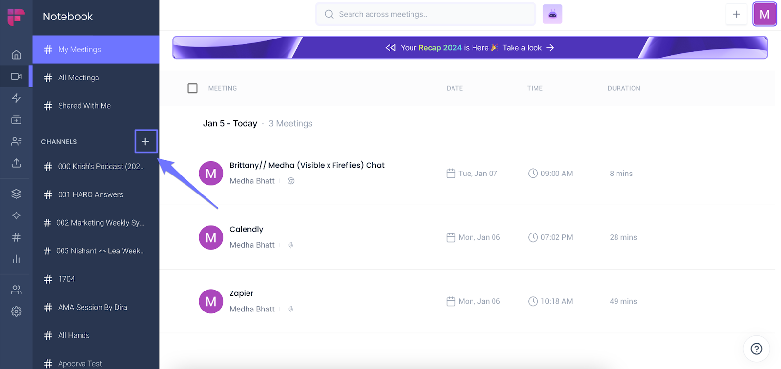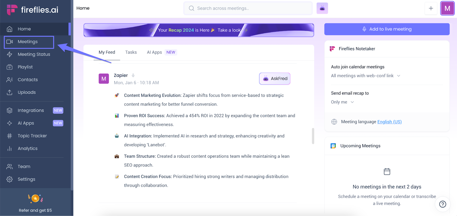 - Click Meetings on the navigation bar to open your Fireflies Notebook.