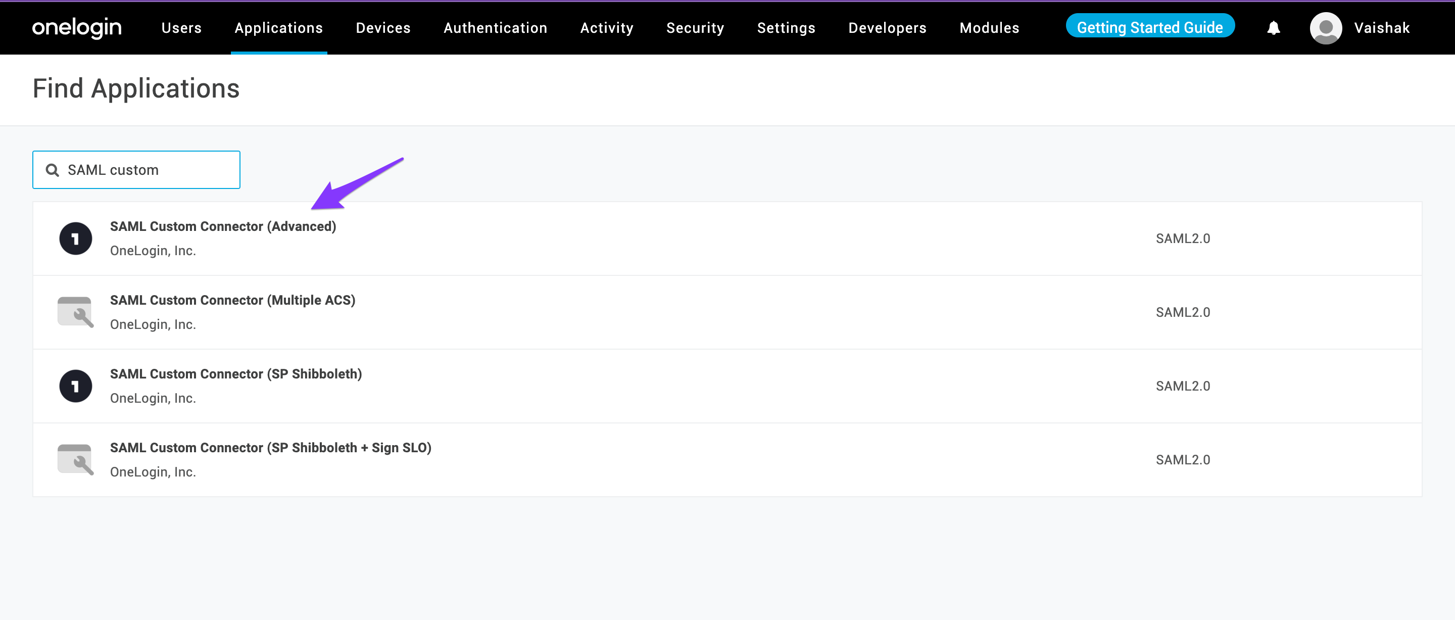 Search for SAML Custom and select SAML Custom Connector (Advanced).