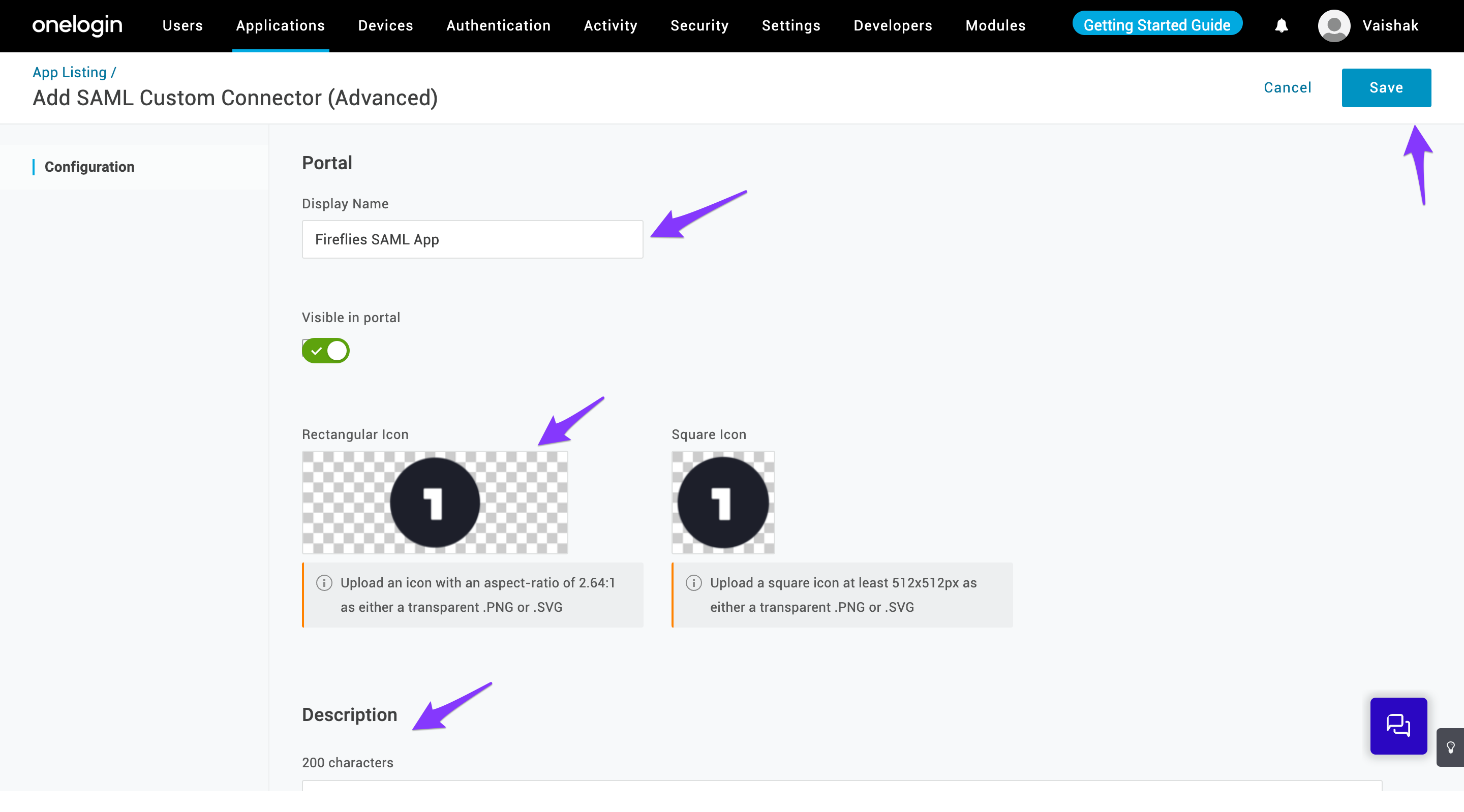 Create the application with a name for example: "Fireflies SAML app". Upload the logo and description. Now, click Save.