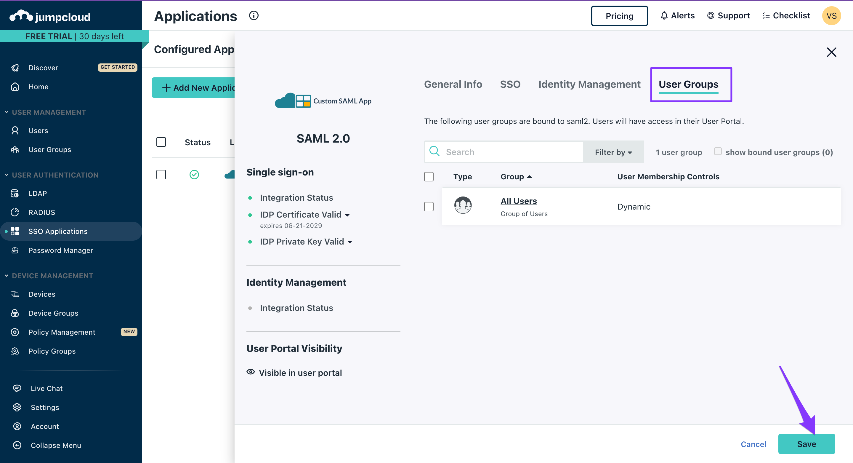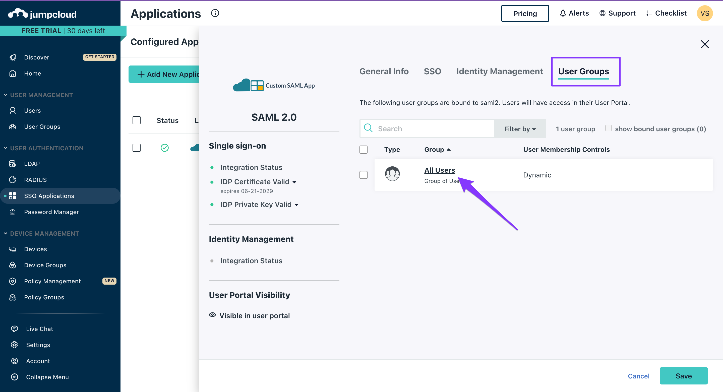 User group assignment in Jumpcloud controls who can access Fireflies via SSO