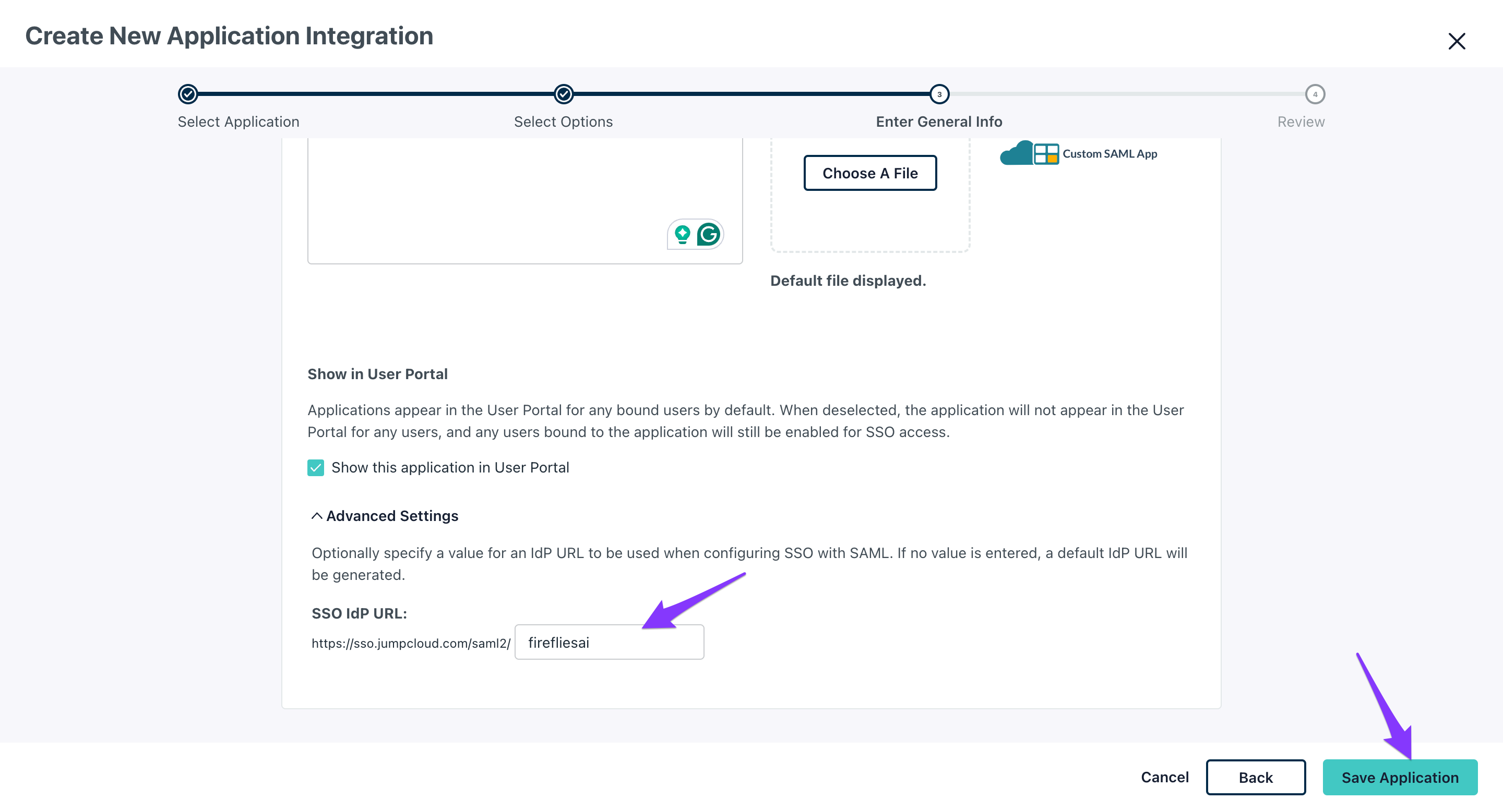 Scroll to Advanced Settings and input firefliesai at the end of the IDP URL