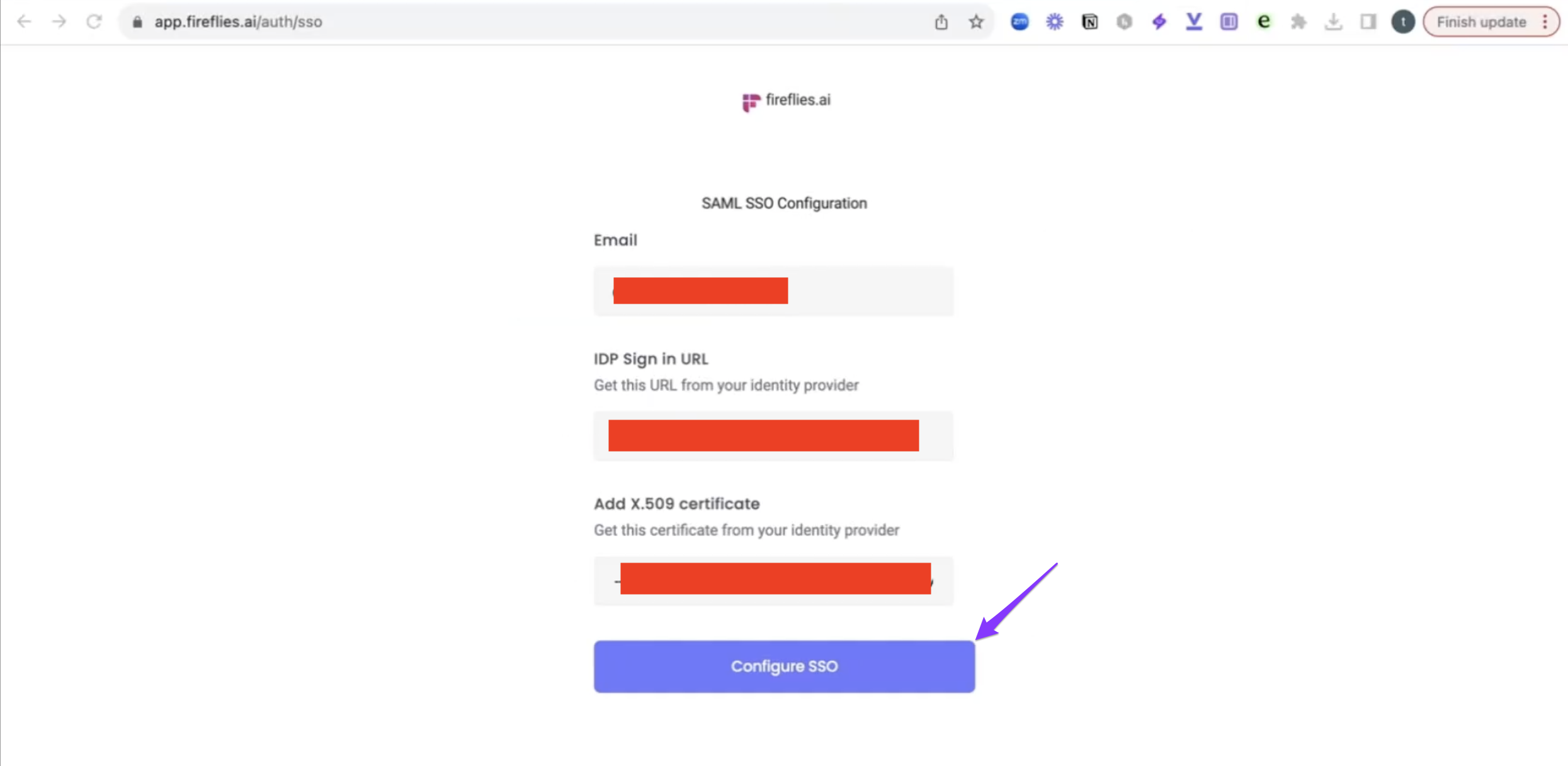 Configure Fireflies - Use the information from step 1 to set up SSO at app.fireflies.ai/auth/sso
