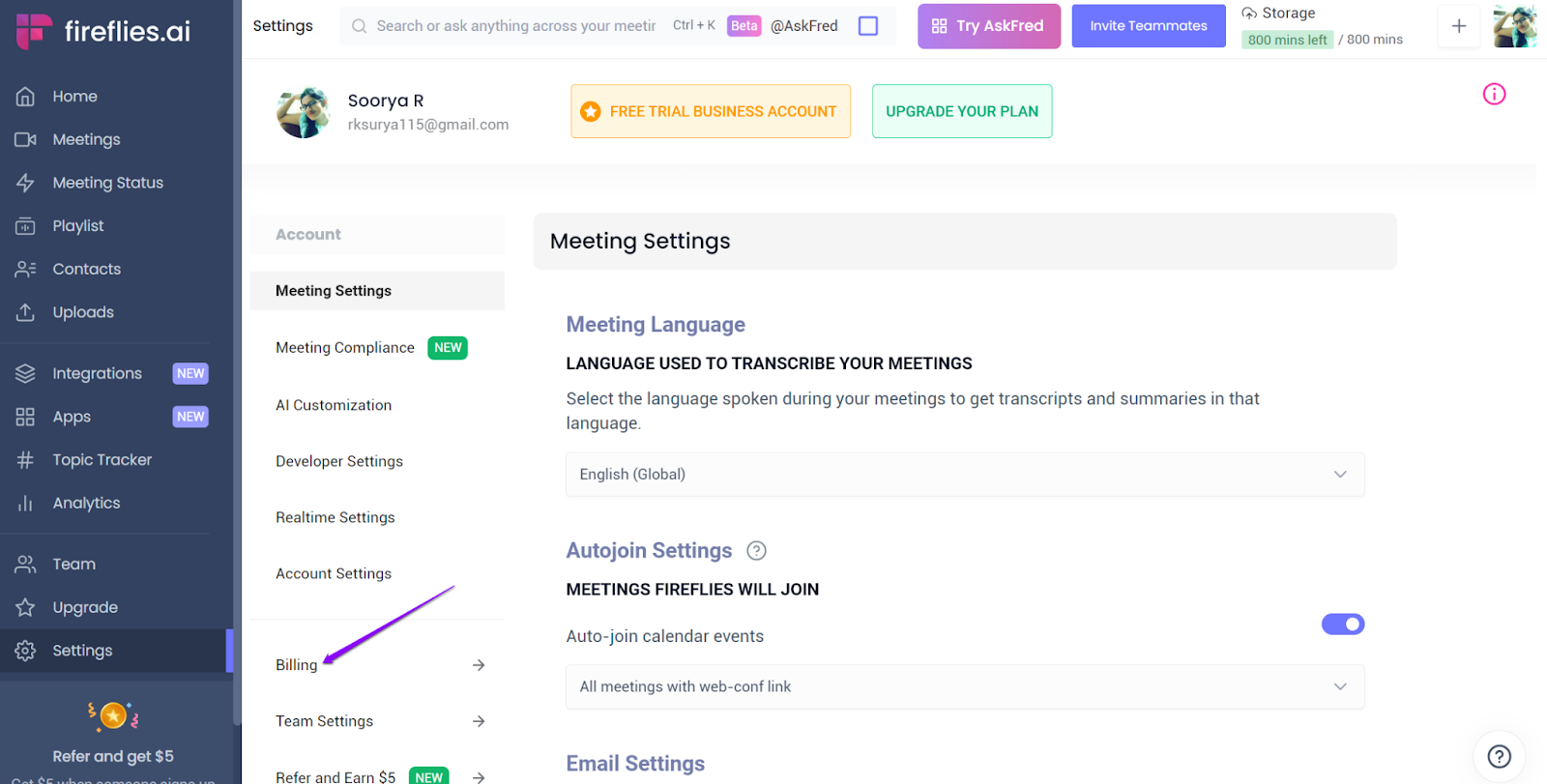- In the Billing section, you can see current invoice details for Fireflies and AI Credits subscriptions, including the next billing date.