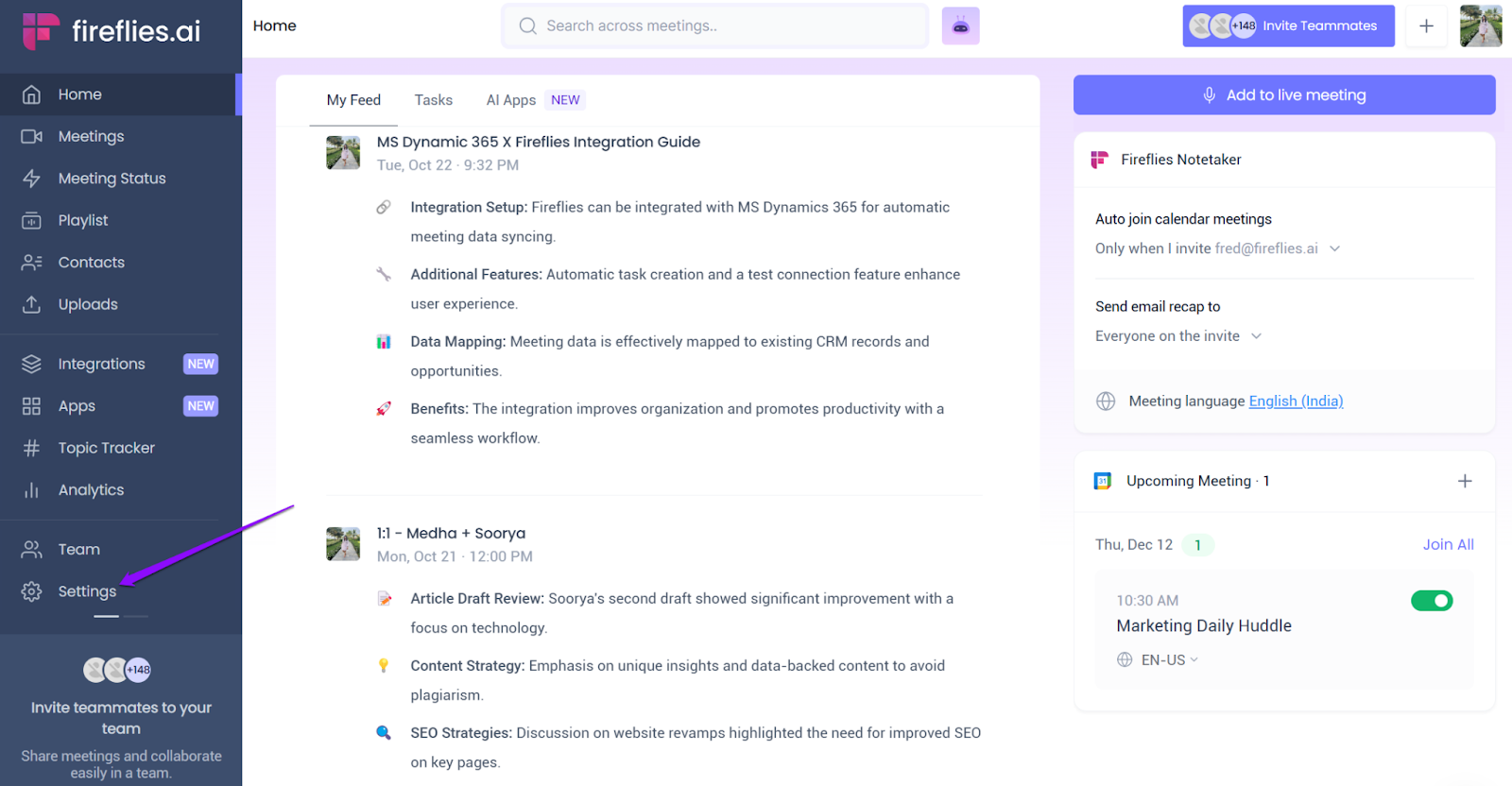 - Log into your Fireflies account via the web app.