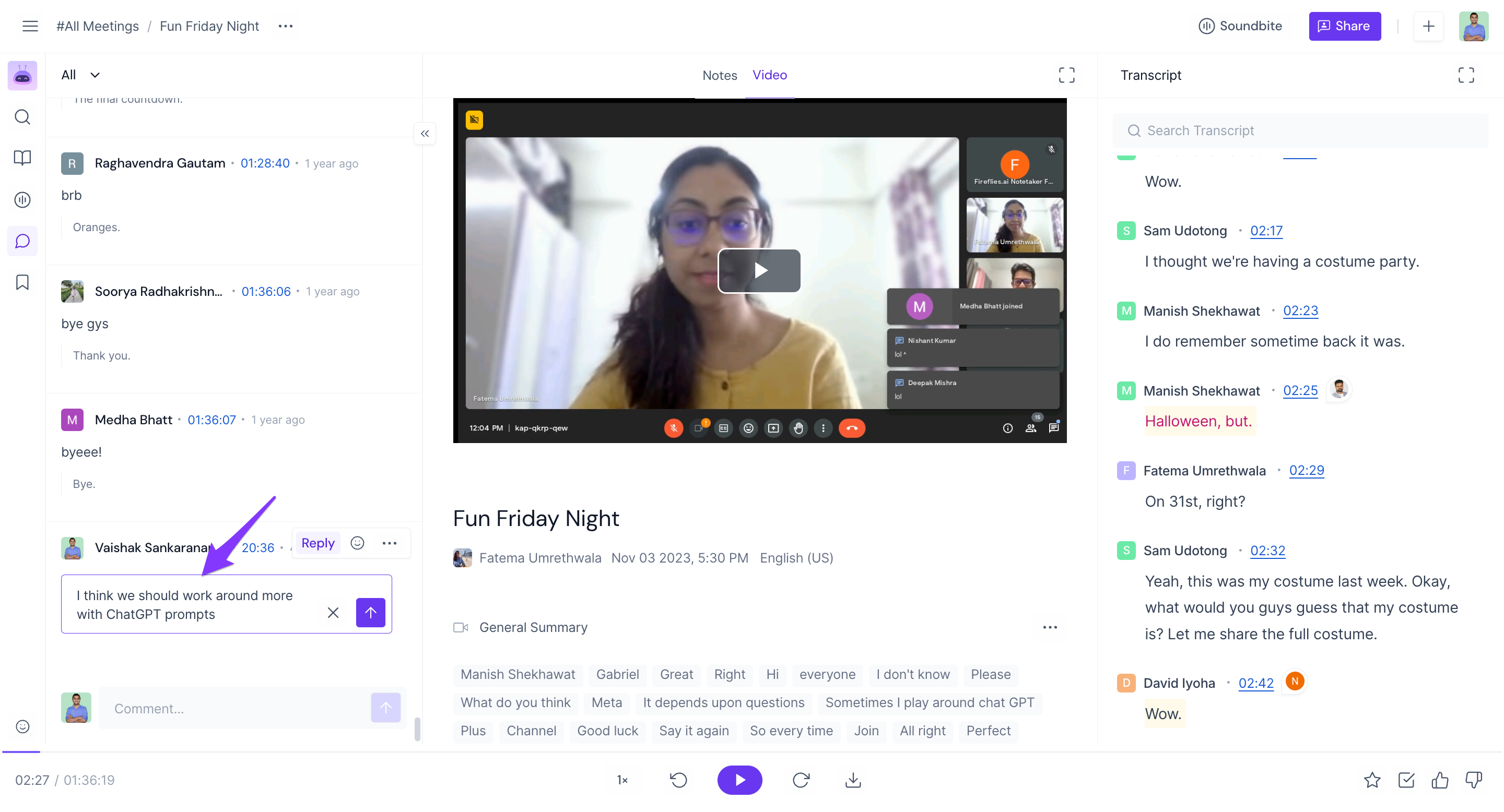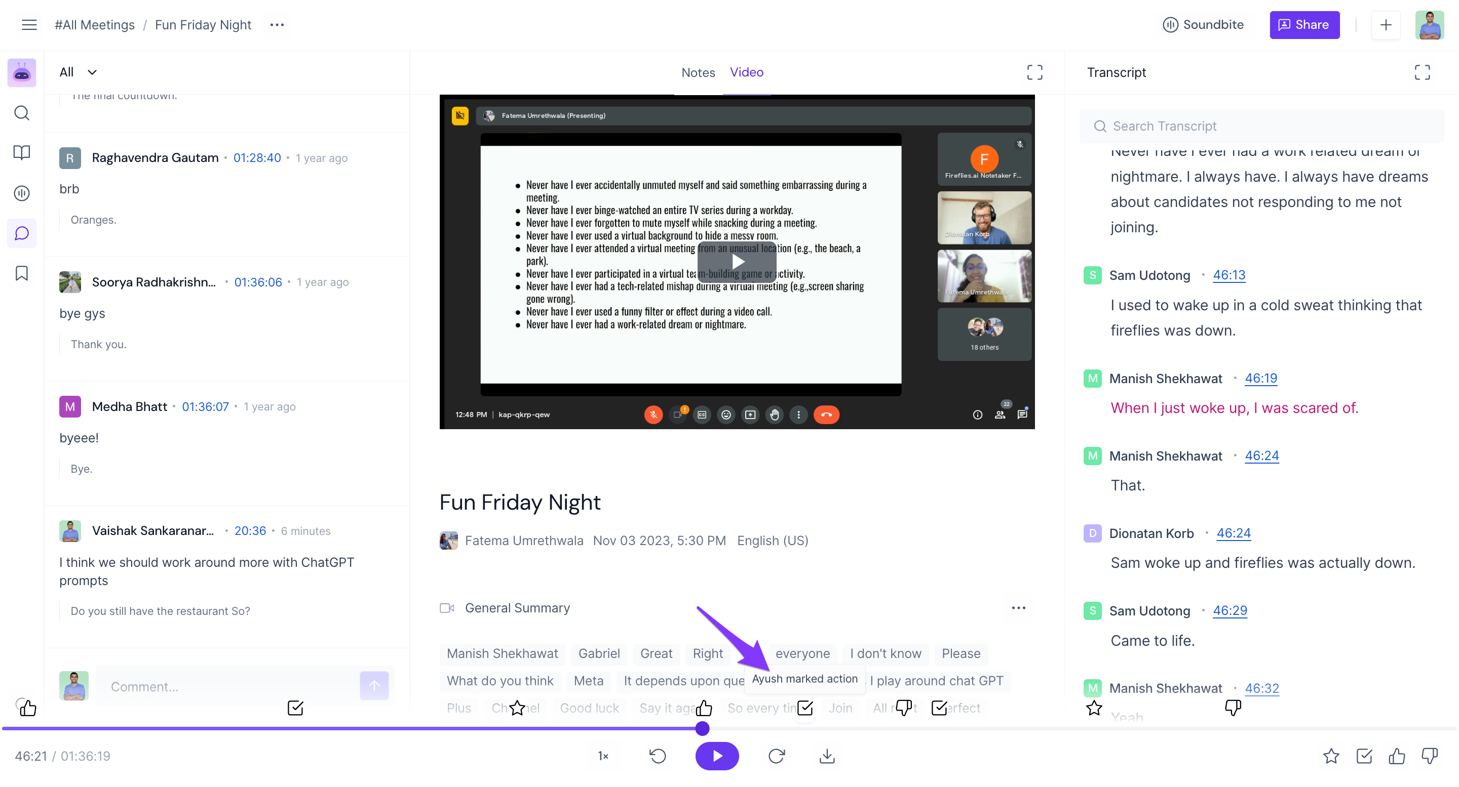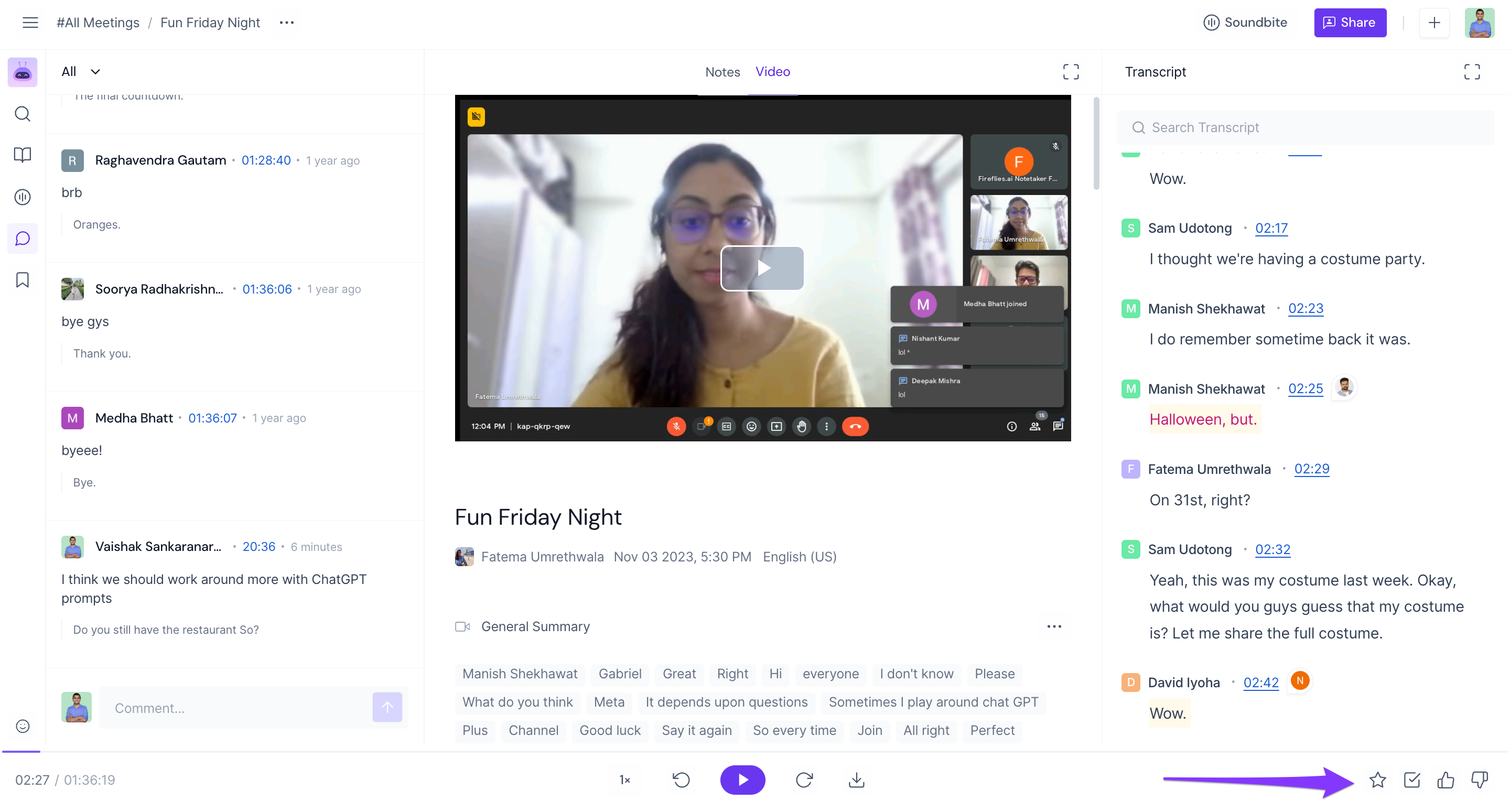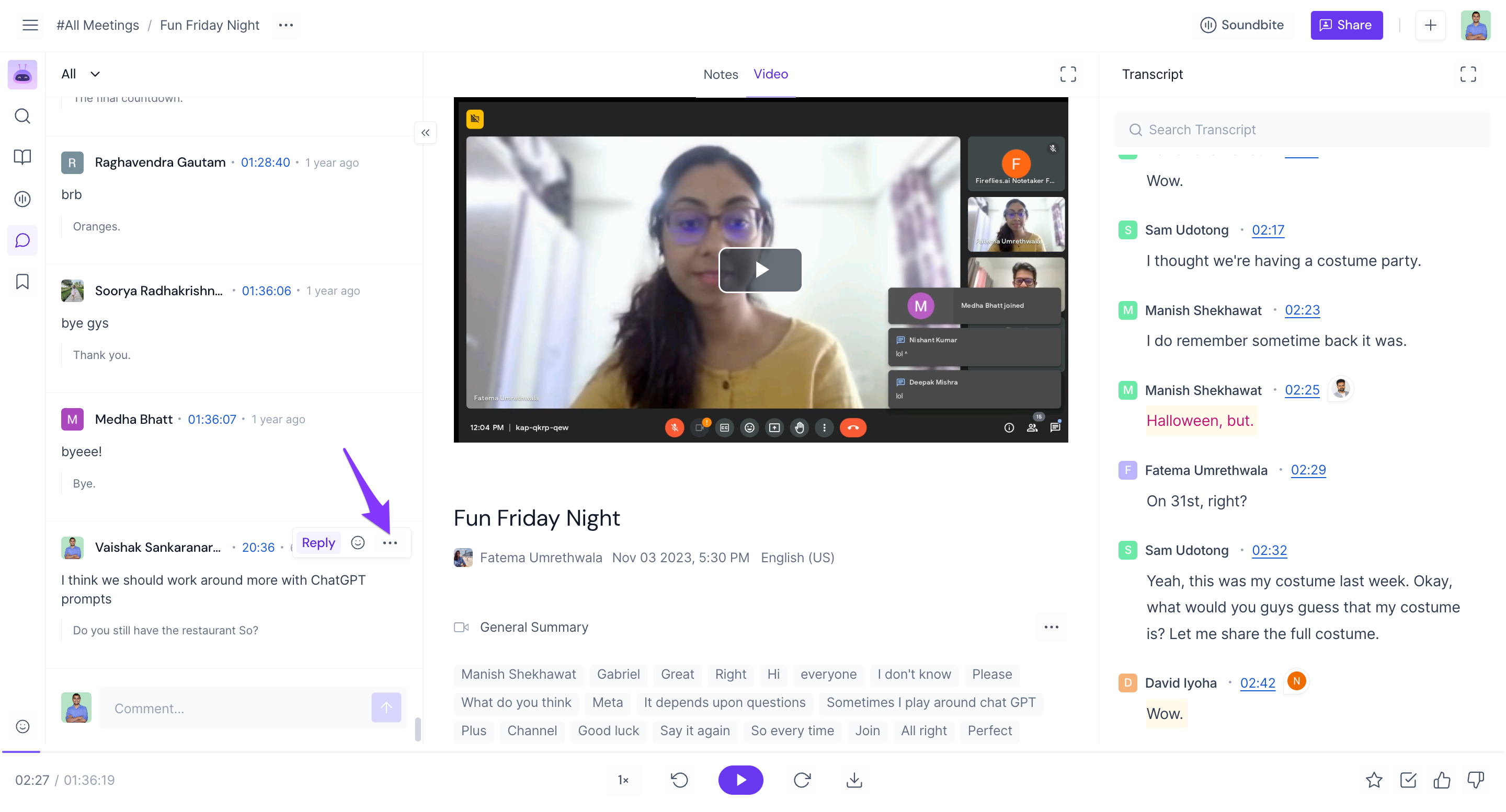 View comments made during the meeting: Fireflies not only records the audio and video of the meeting but also saves all the comments made by participants.