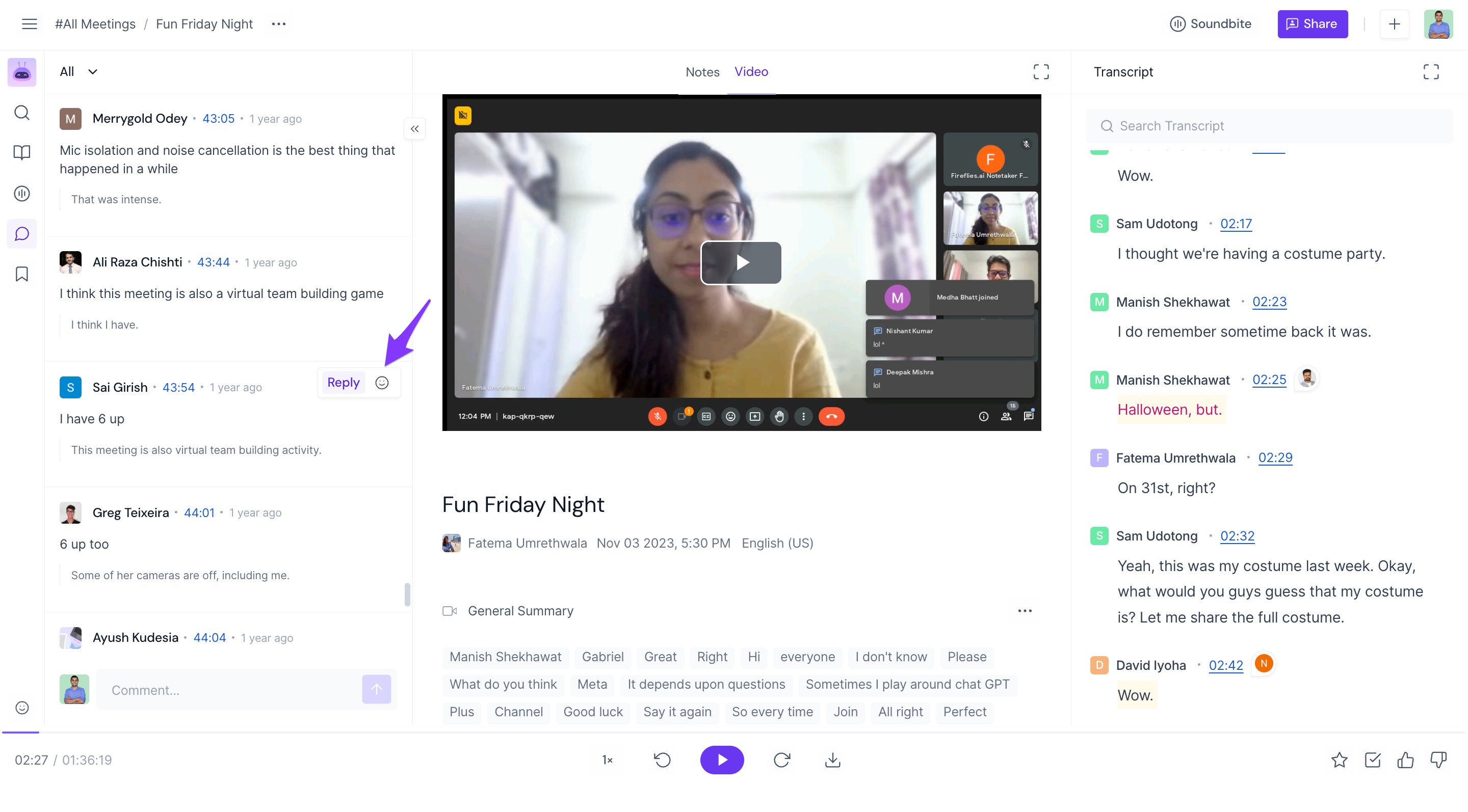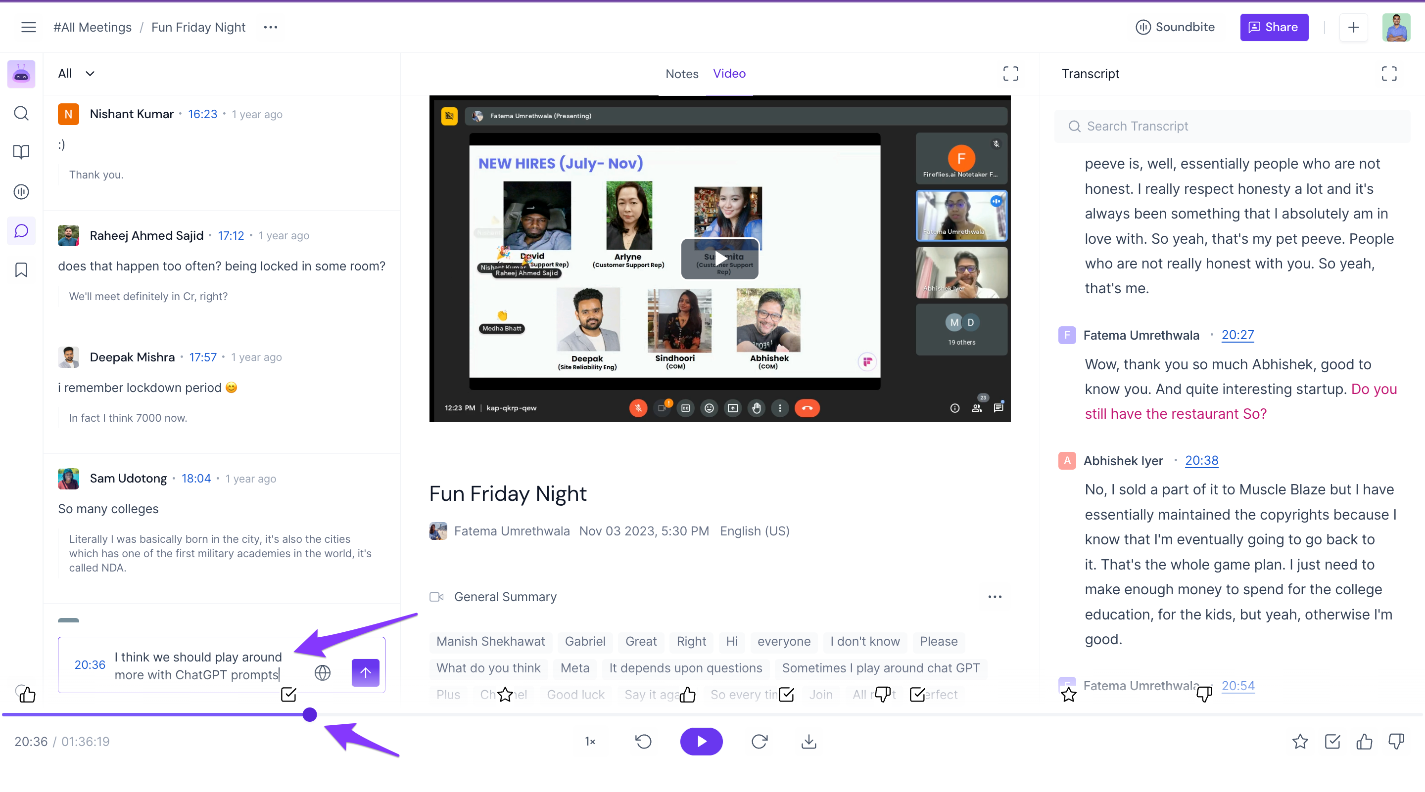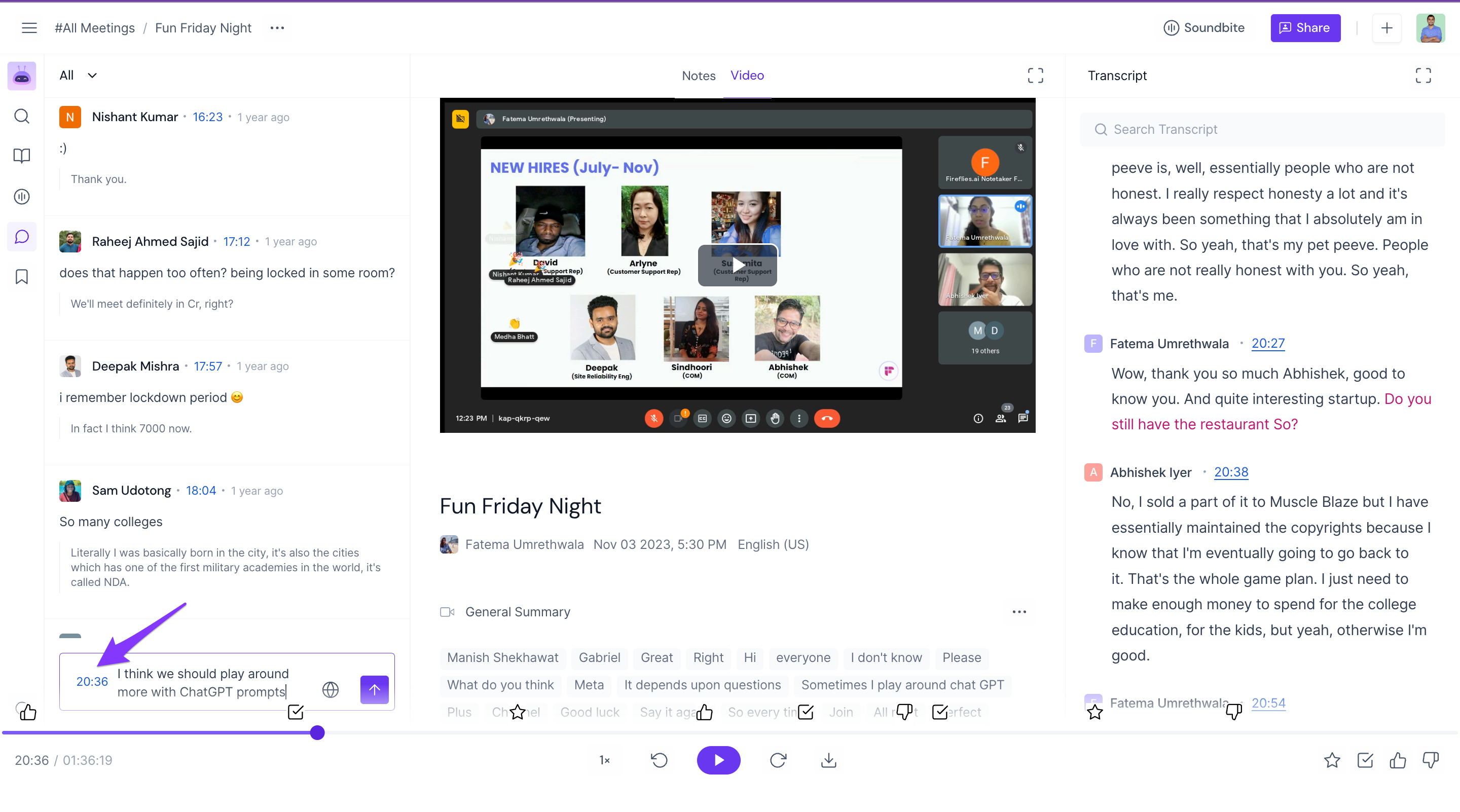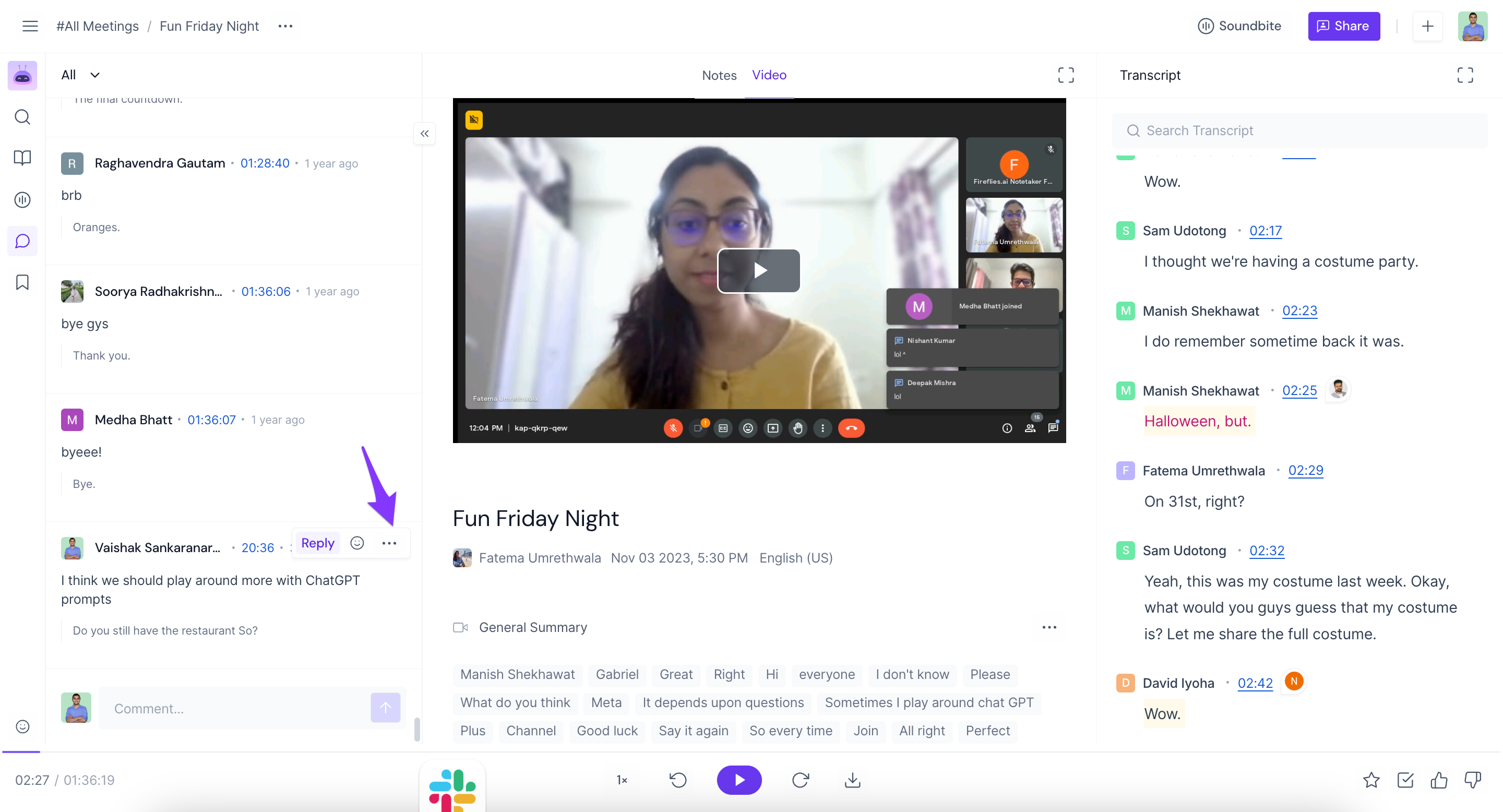 View comments made during the meeting: Fireflies not only records the audio and video of the meeting but also saves all the comments made by participants.