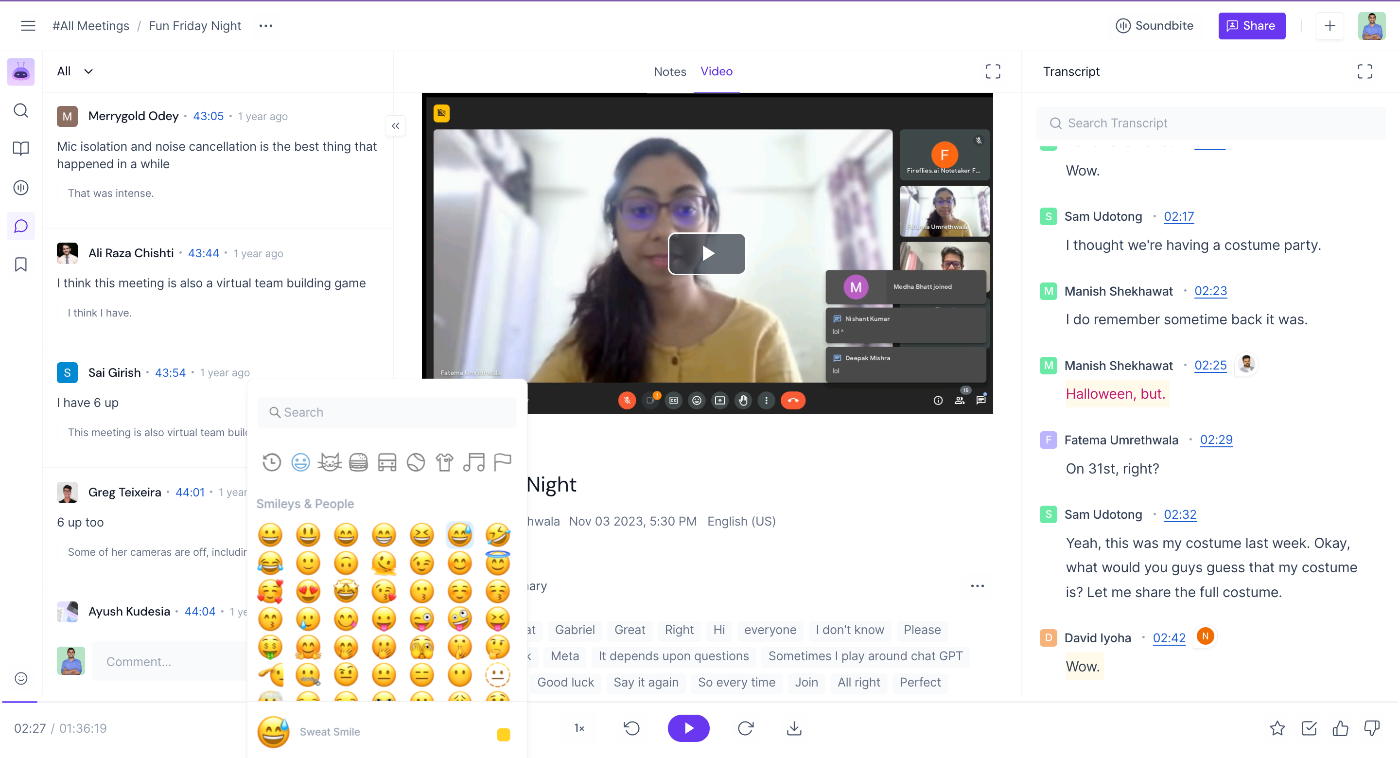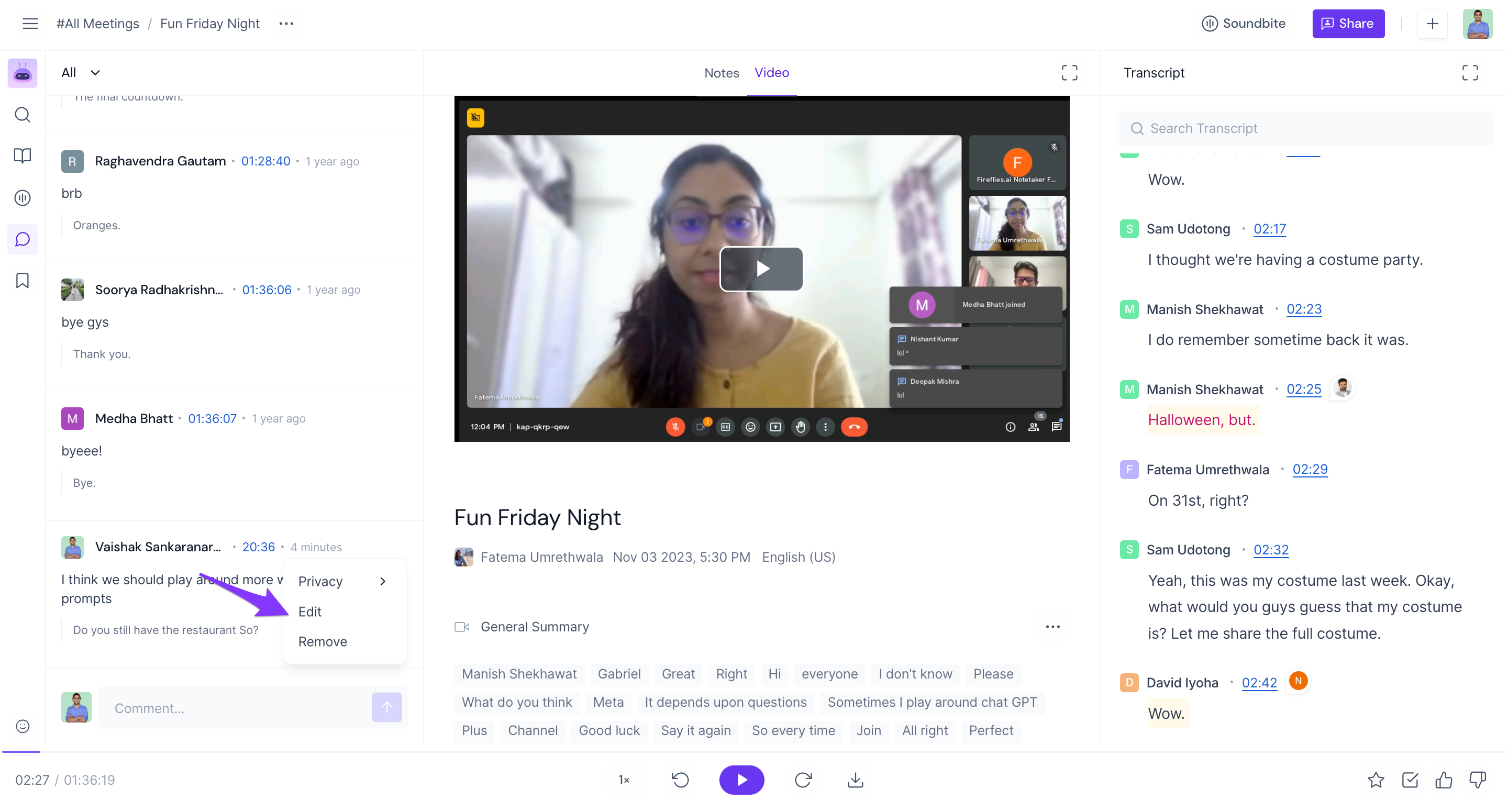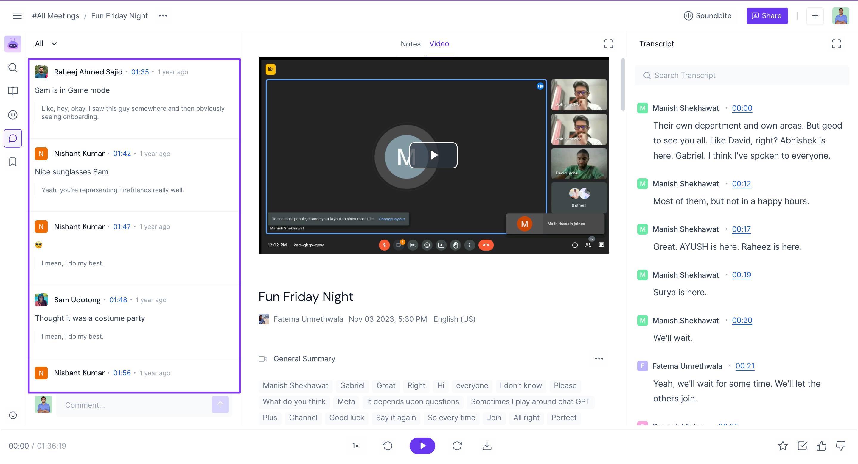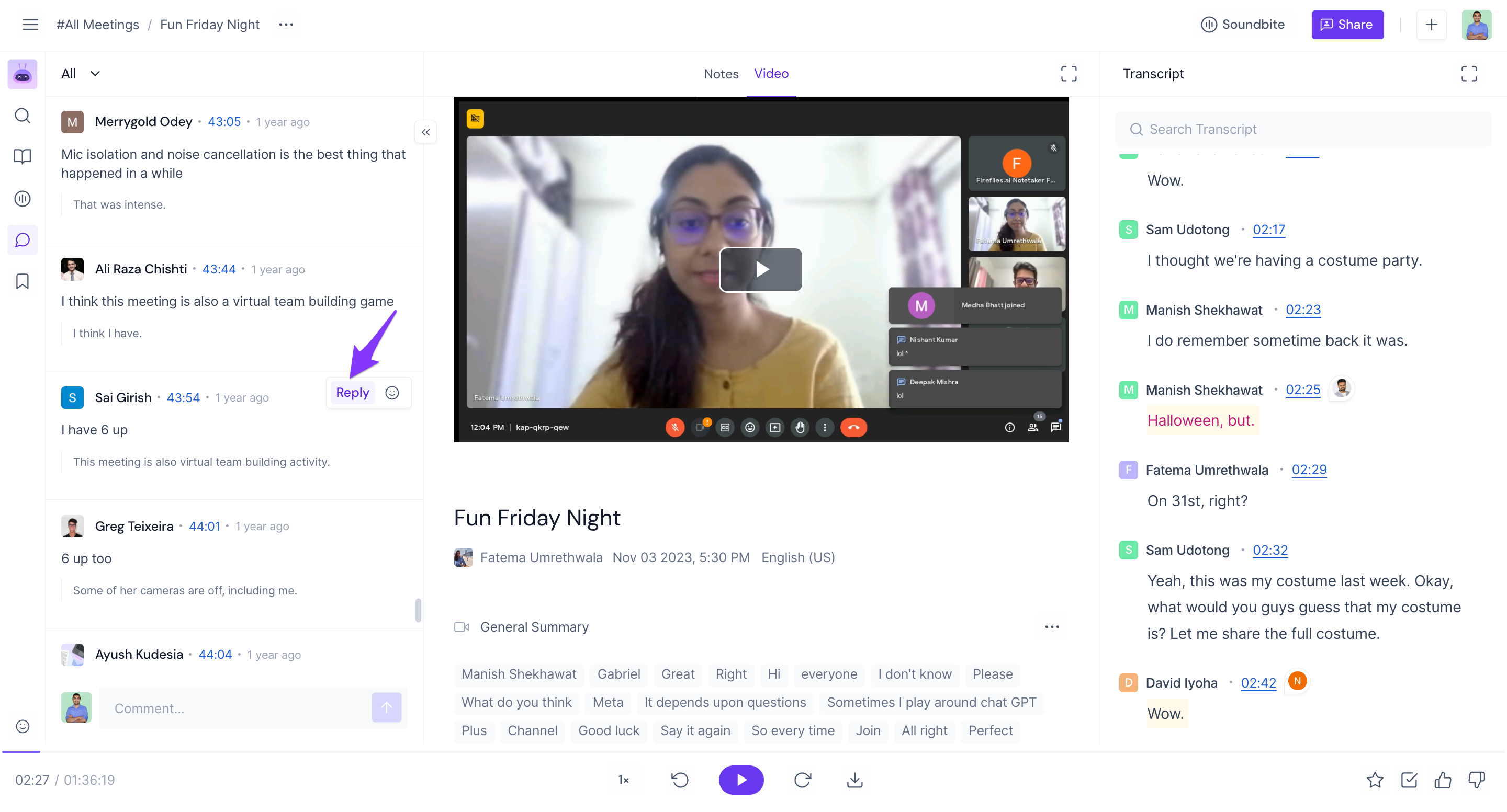 View comments made during the meeting: Fireflies not only records the audio and video of the meeting but also saves all the comments made by participants.