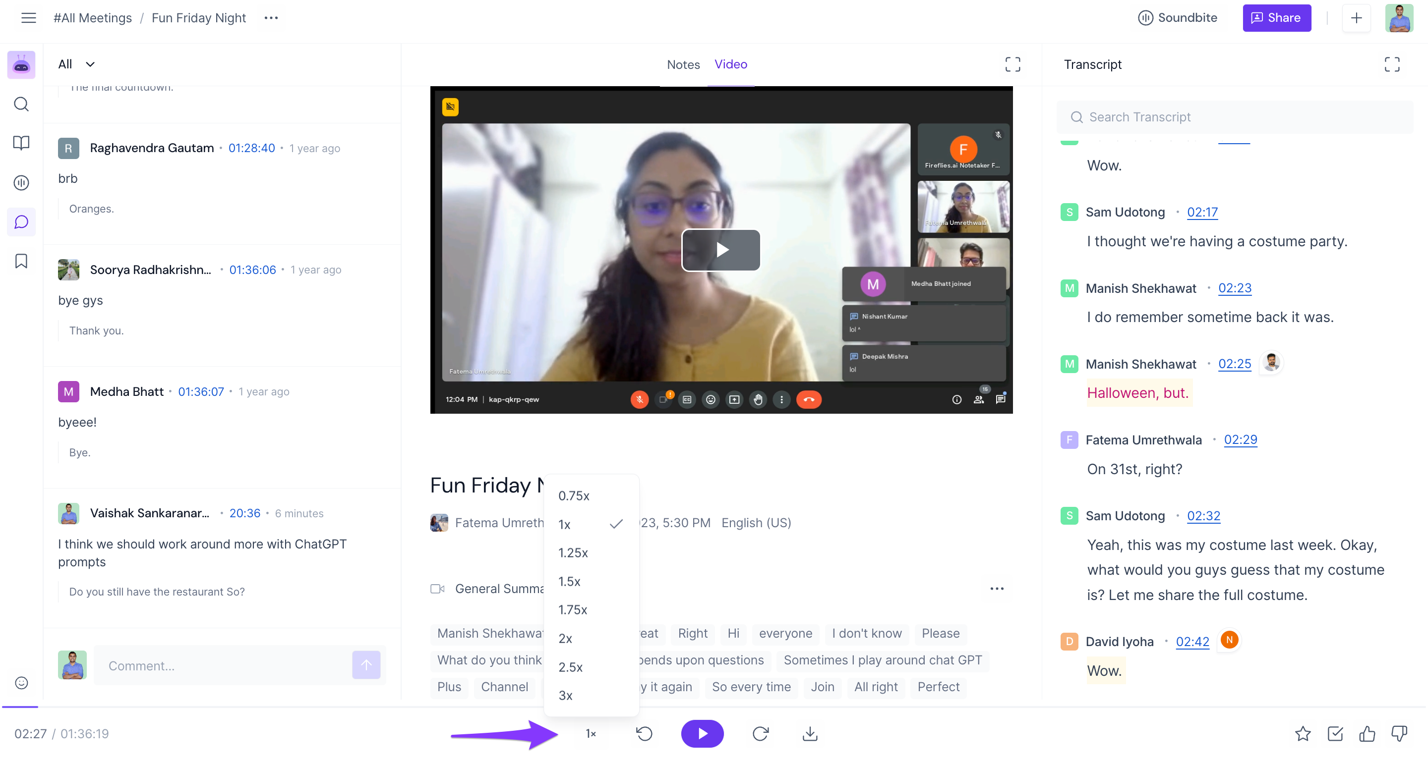 • Play the meeting at 0.75x to 3x speed.