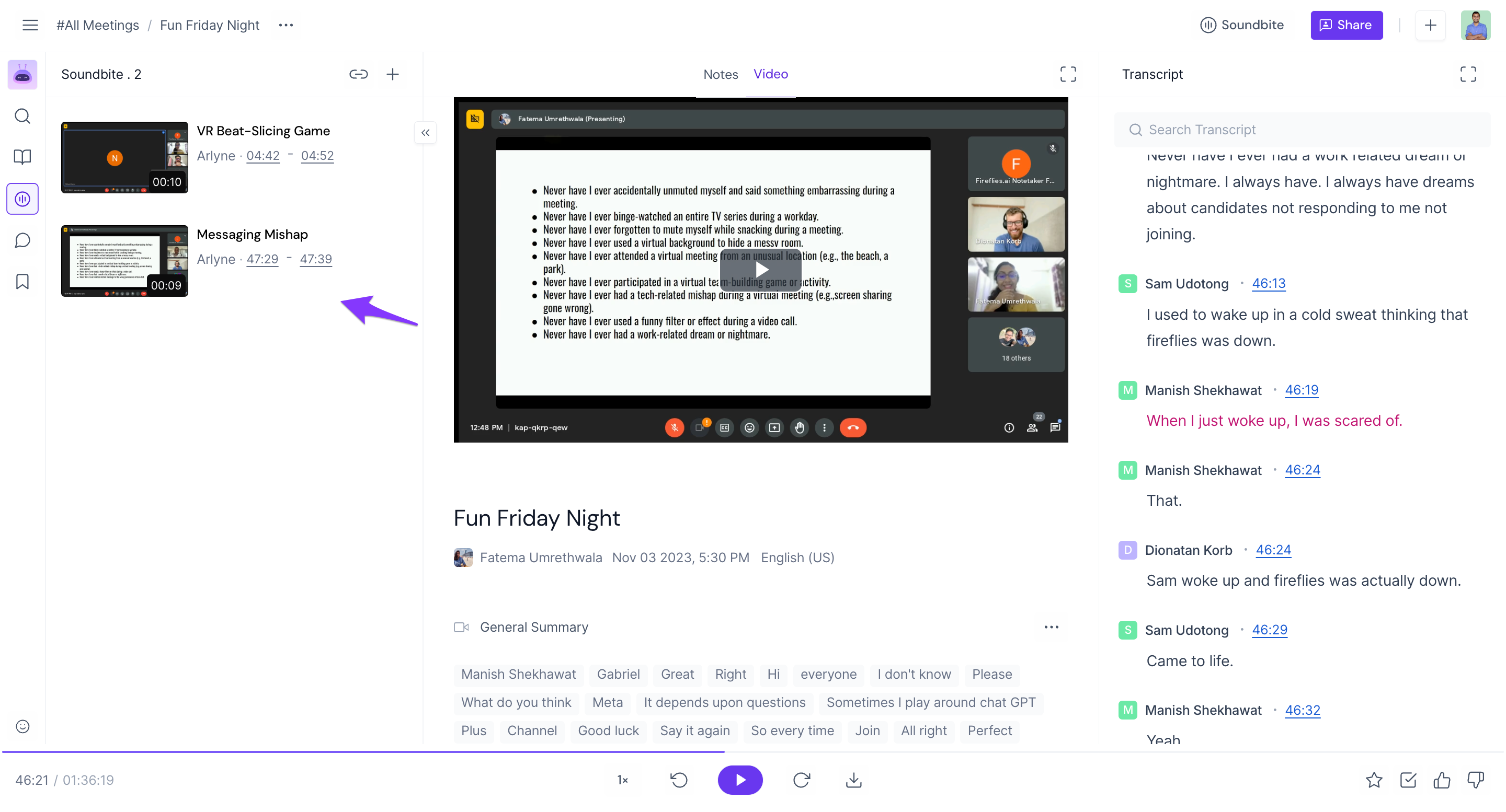 3. Keyword Soundbites: Fireflies creates soundbites relevant to specific keywords and phrases.