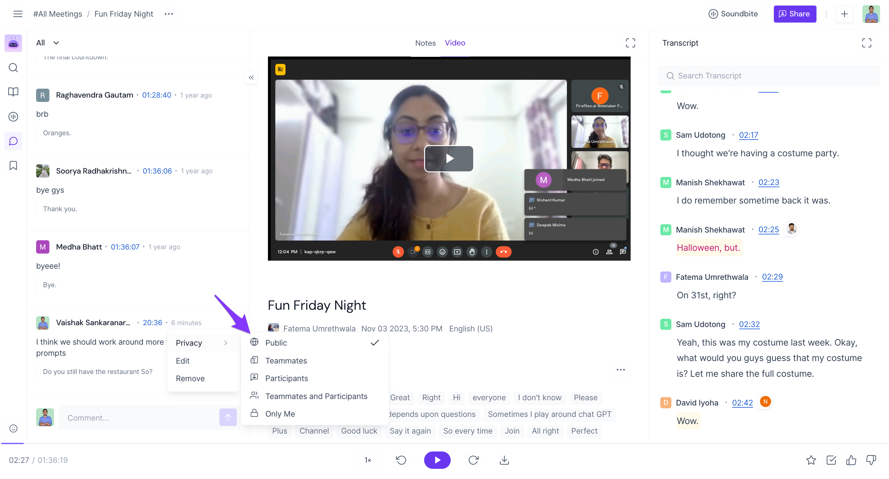Note: This only applies to new comments made within the Fireflies meeting notes. Comments made during the meeting are always public and can be viewed by anyone.