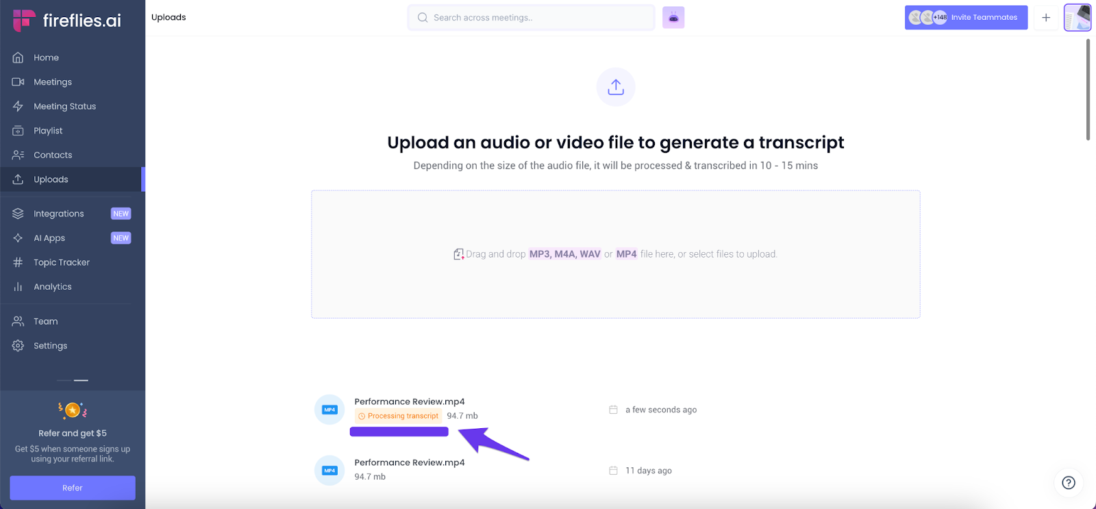 Note: Fireflies usually transcribes hour-long recordings within minutes after uploading.
