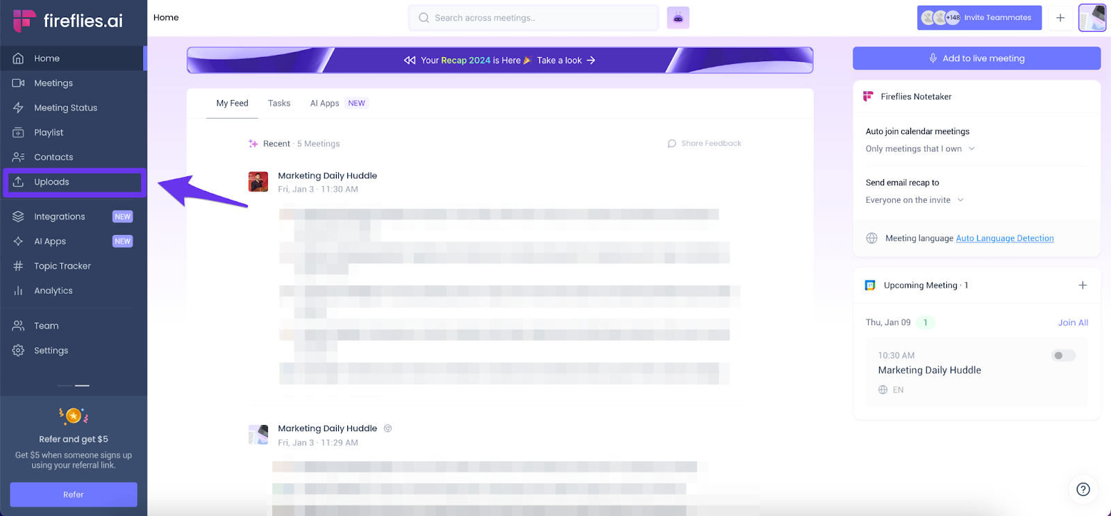 • Go to the Fireflies web app and click Uploads.