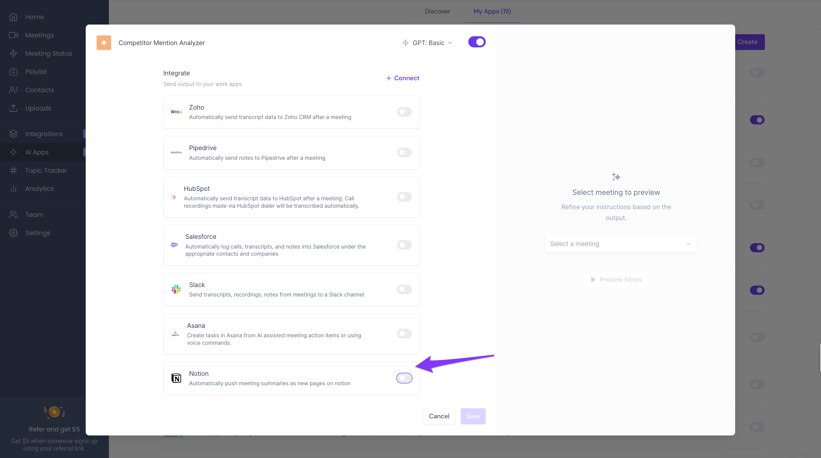 - Scroll down to Integrations and enable the toggle next to Notion.