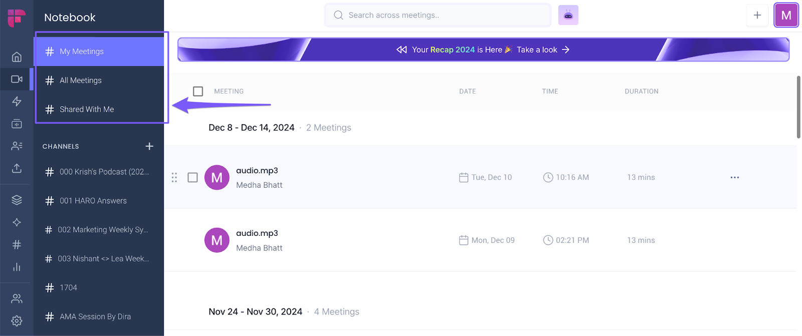 Shared with Me: Lists all the meetings that others have shared with you or you've participated in
