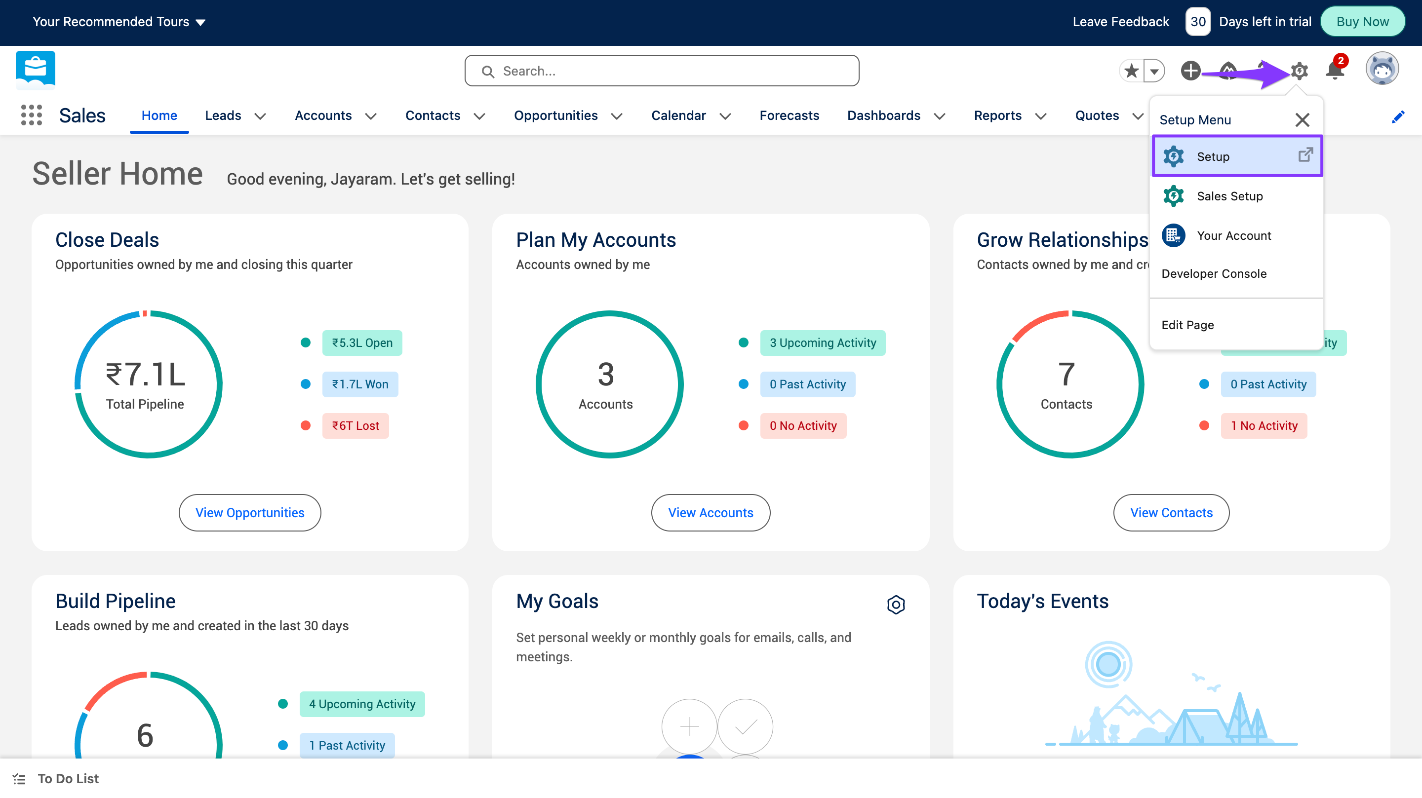 - Click the Salesforce Settings and select Setup.