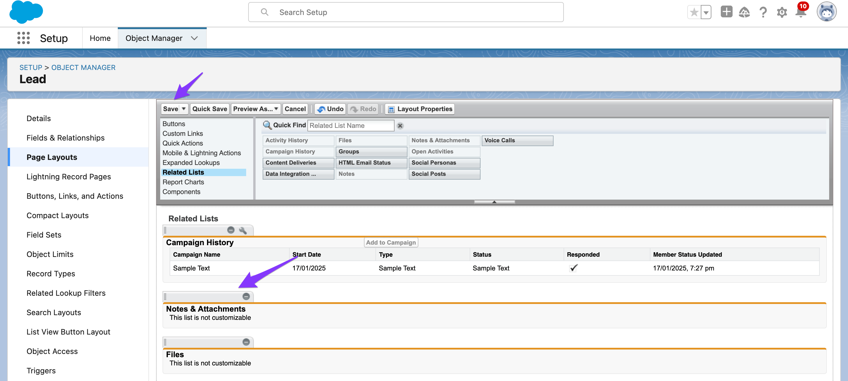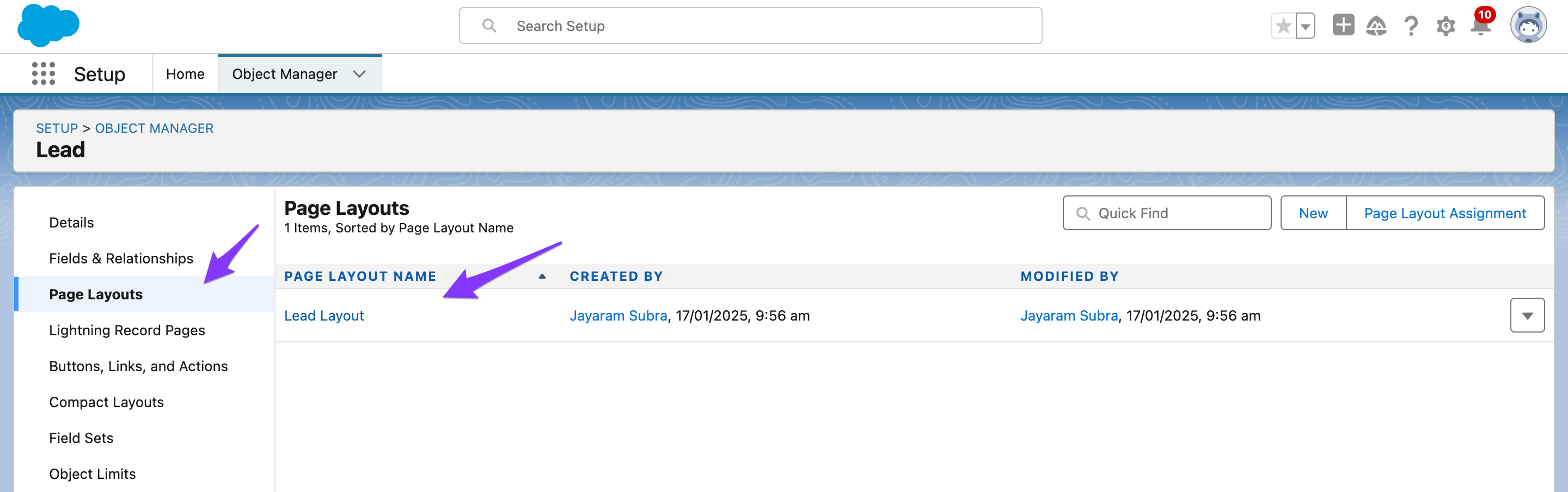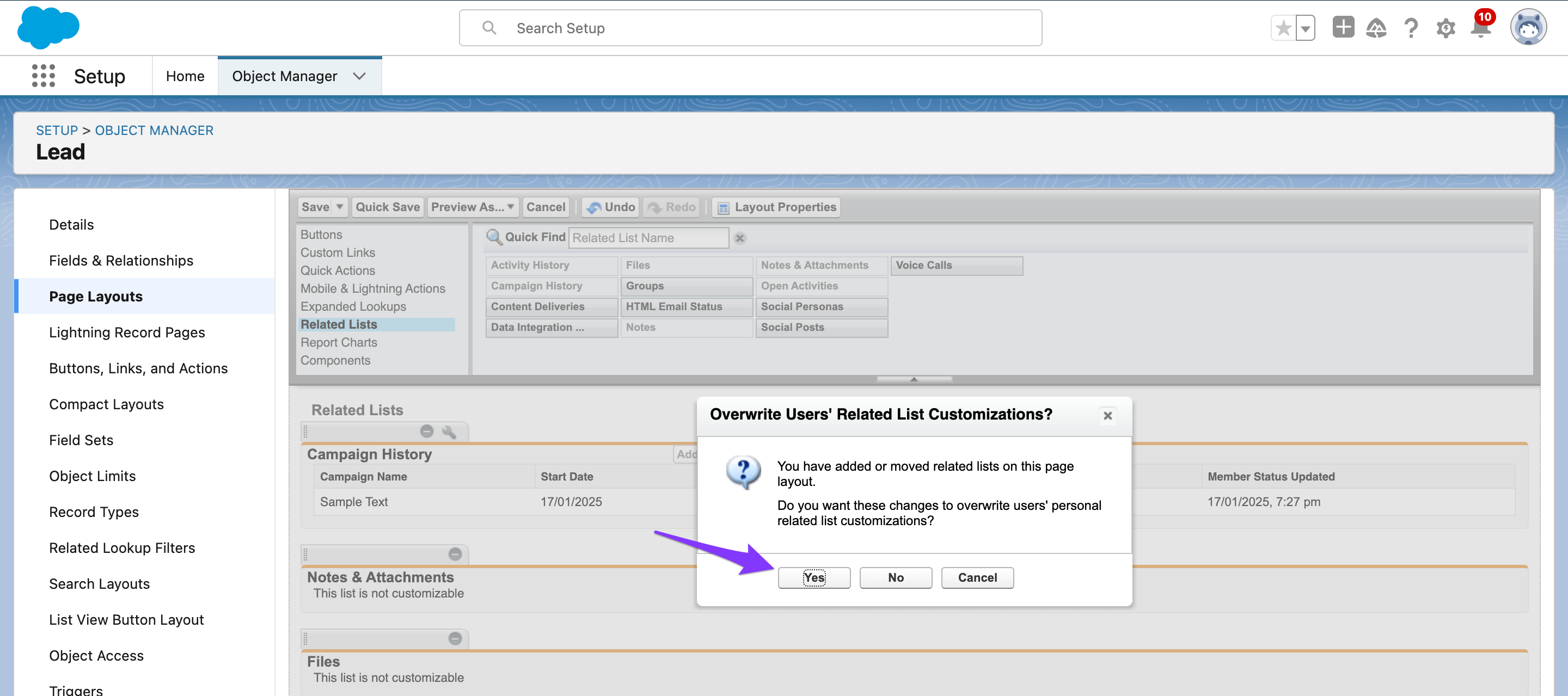 - Click on the Page Layouts and select the Lead Layout.