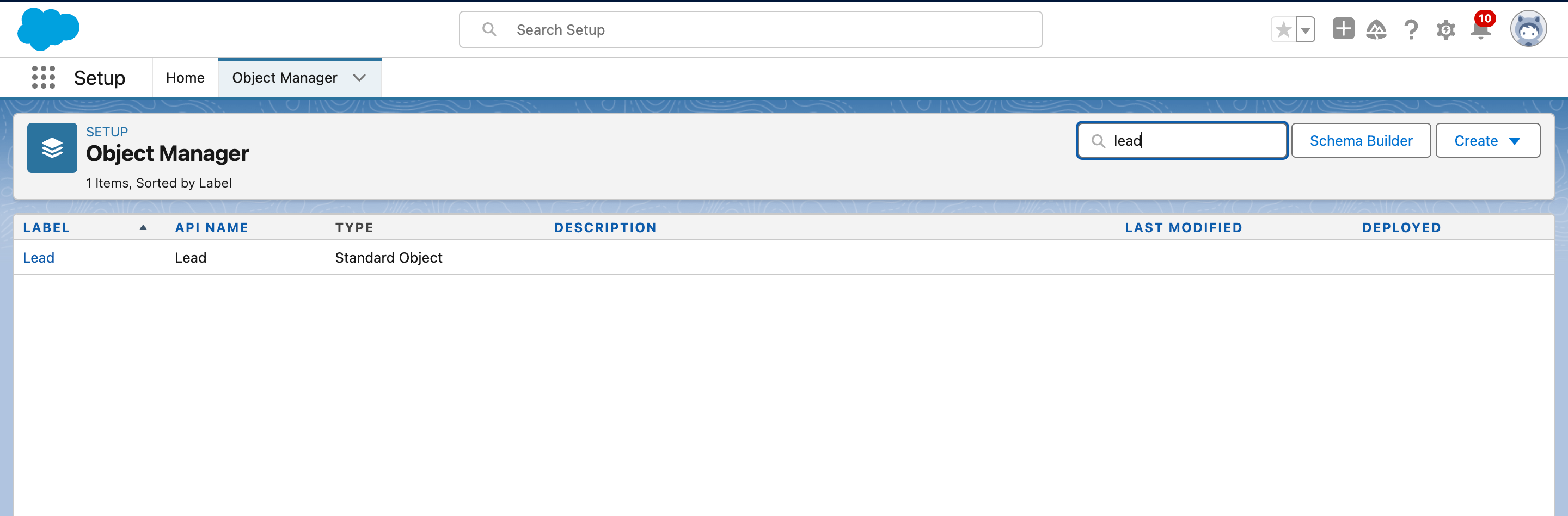 - Under the quick find search bar, type in Lead. Click on the Lead object.