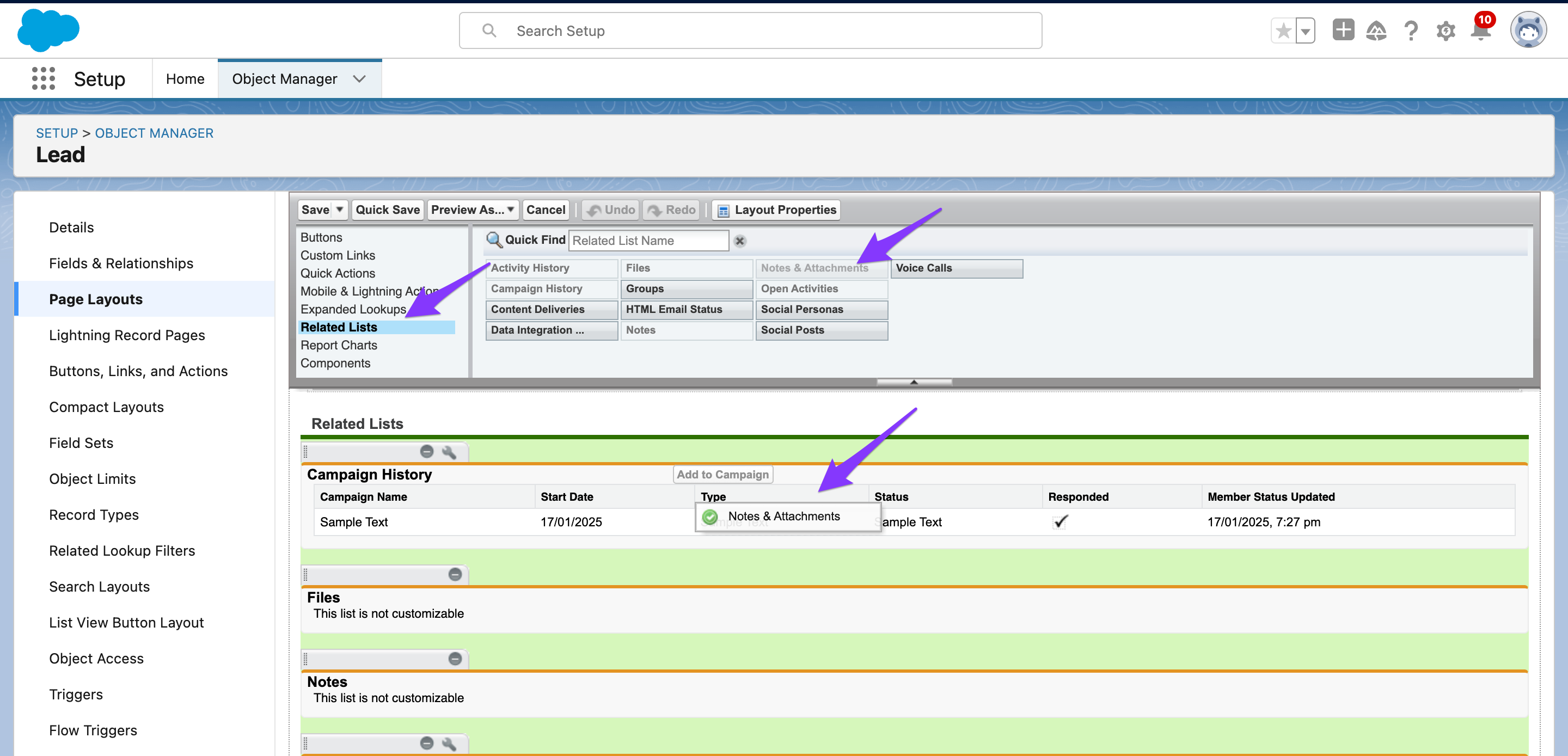 Here are the steps to add the Notes & Attachments related list to the lead page layout: